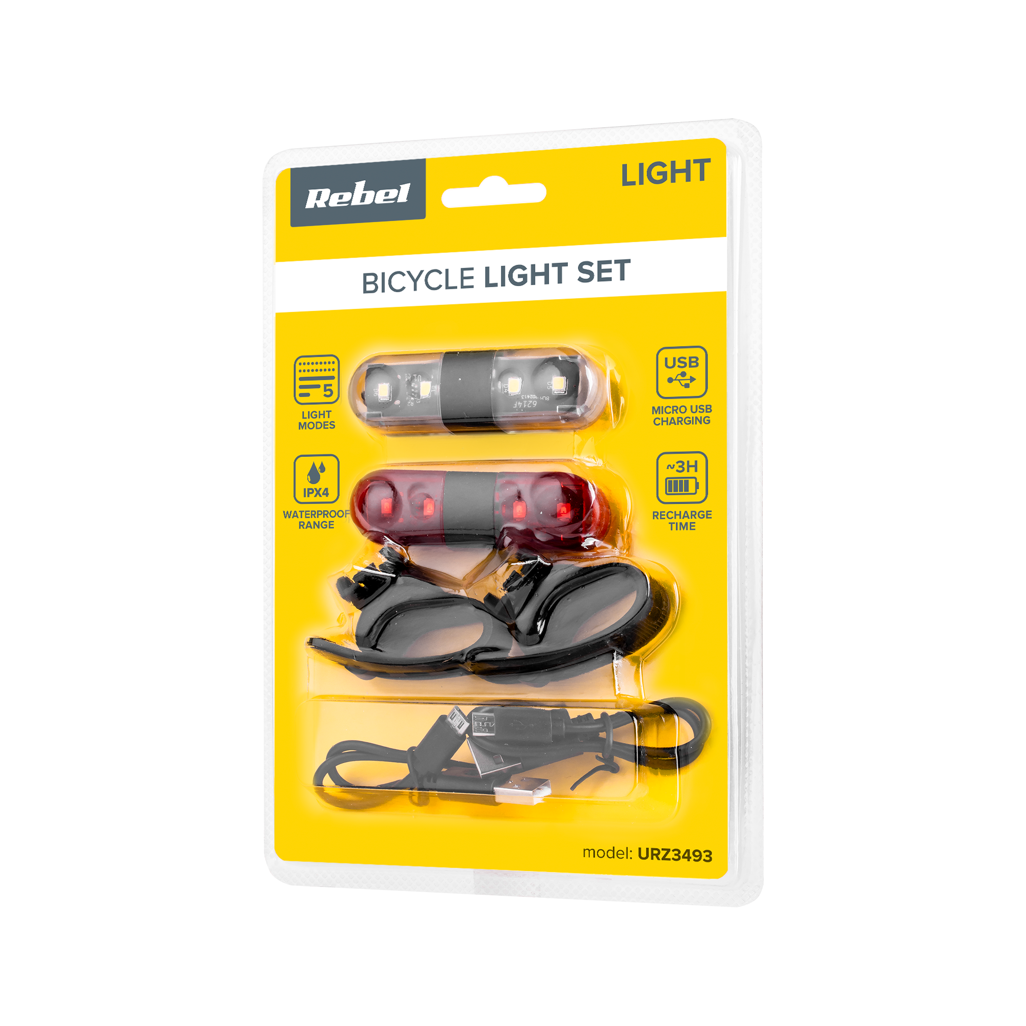Lampka rowerowa tylna przednia LED USB 2 szt RebelZadbaj o swoją widoczność na drodze z kompletem świateł do roweru Rebel. Zestaw składa się z lampy przedniej i tylnej, które zapewniają doskonałe oświetlenie, poprawiając Twoje bezpieczeństwo podczas jazdy po zmroku. Lampa przednia emituje zimne białe światło o strumieniu 60 lumenów, a lampa tylna czerwone światło o strumieniu 15 lumenów, dzięki czemu jesteś widoczny z daleka.