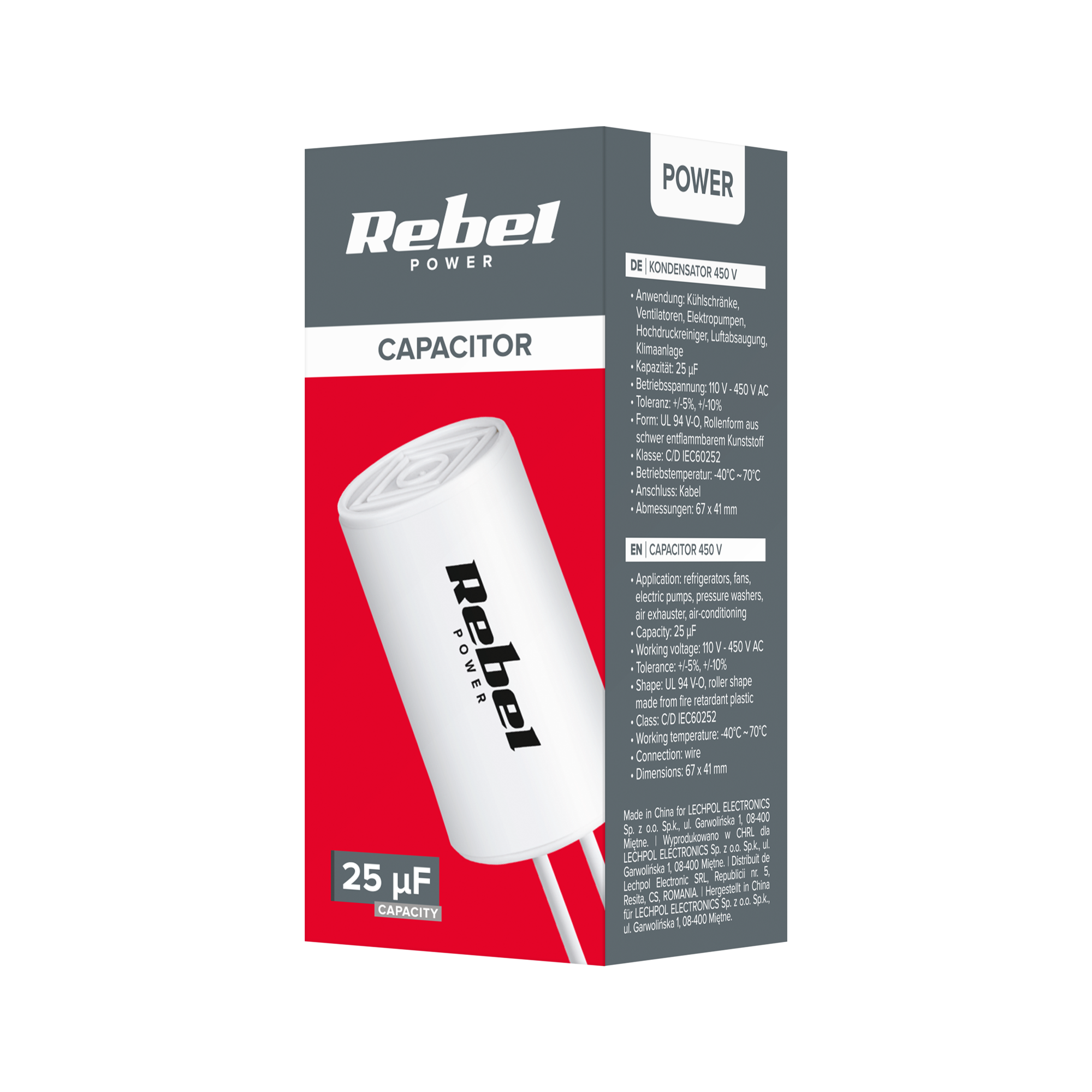 Kondensator o pojemności 25 uF i napięciu roboczym 450 V to niezawodne rozwiązanie dedykowane do zasilania silników jednofazowych, takich jak te stosowane w lodówkach, wentylatorach, pompach elektrycznych, myjkach, wywietrznikach oraz systemach klimatyzacyjnych. Dzięki solidnej konstrukcji i wysokiej jakości materiałom, kondensator zapewnia stabilne działanie i długą żywotność urządzeń.