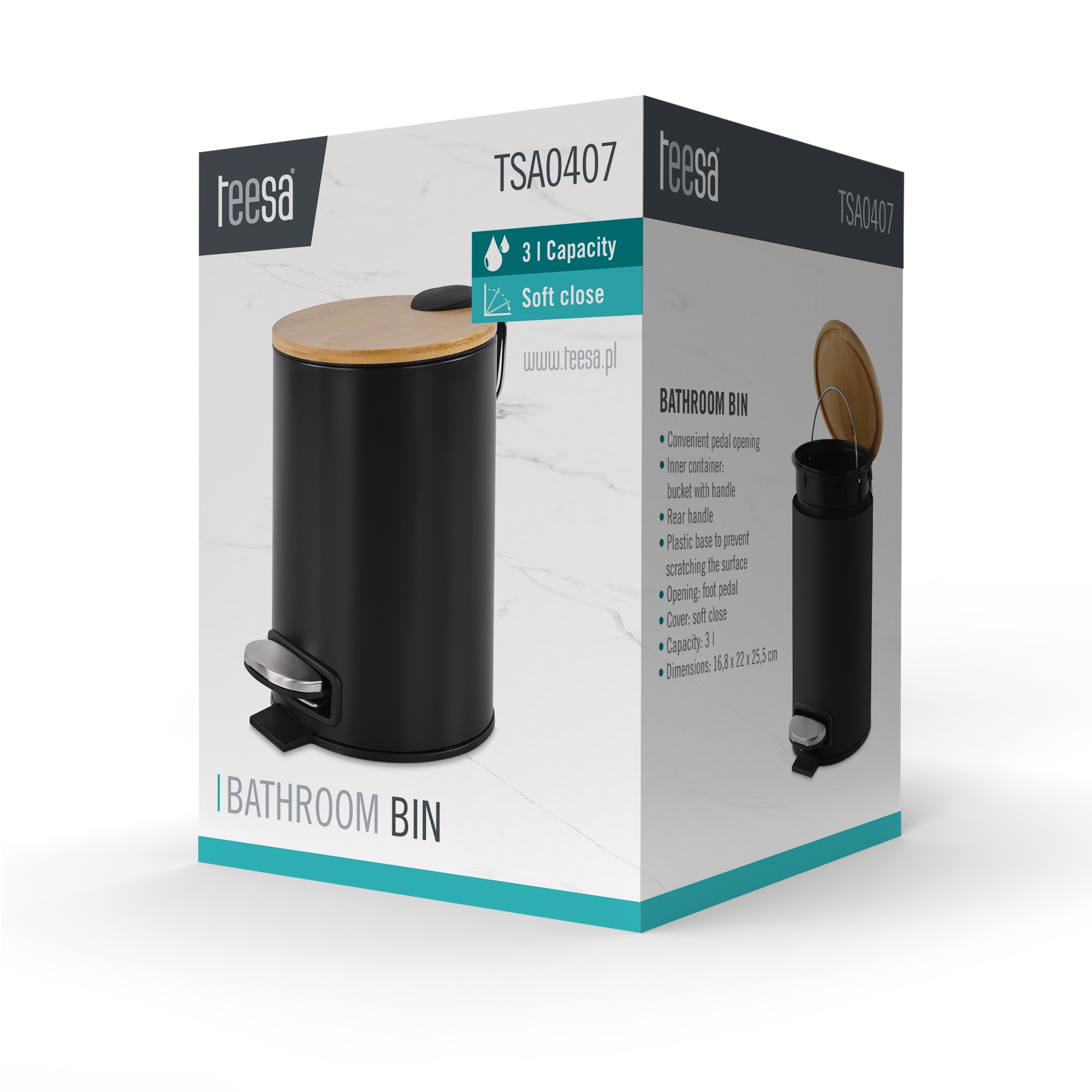 Łazienkowy kosz na śmieci Teesa Elegancki i praktyczny kosz łazienkowy o pojemności 3 l łączy nowoczesny design z funkcjonalnością. Dzięki kompaktowym wymiarom idealnie sprawdzi się w małych przestrzeniach, a solidne materiały zapewniają trwałość i łatwość utrzymania w czystości, czyniąc codzienne korzystanie wygodnym i higienicznym.