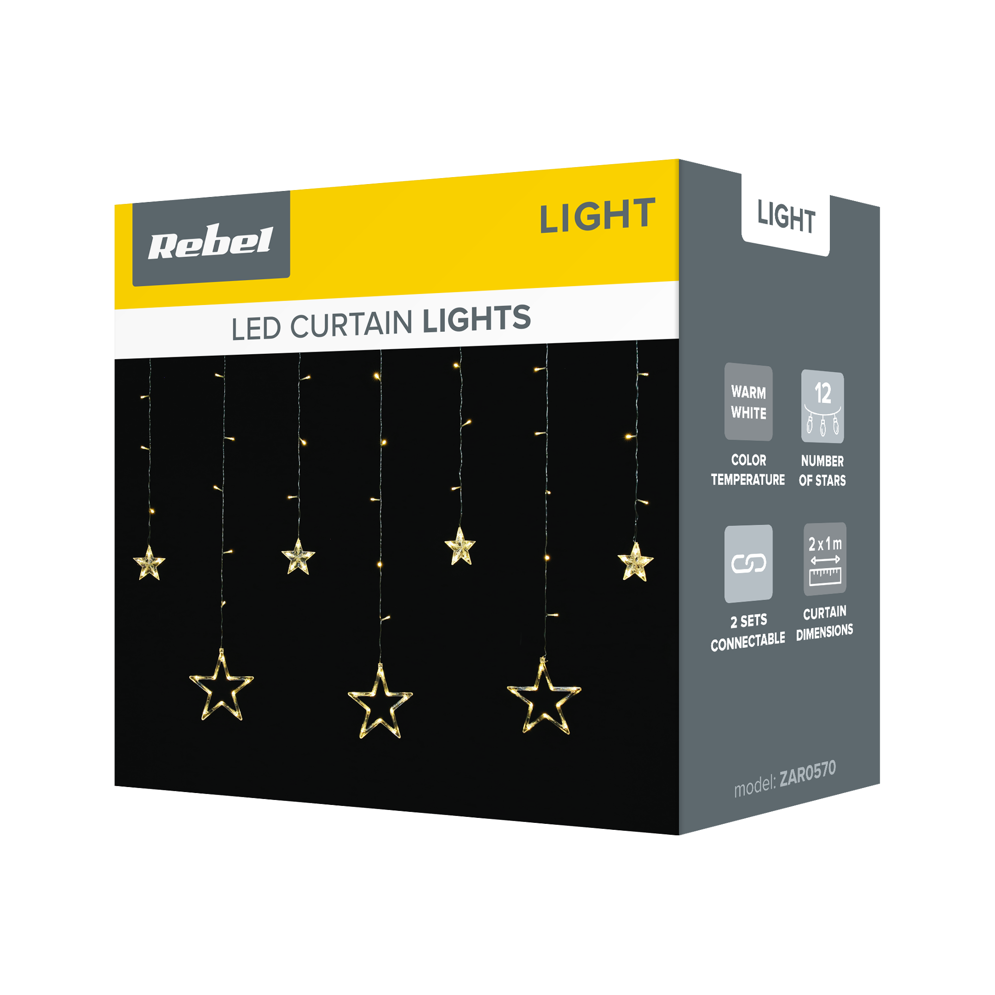 Girlanda świetlna - gwiazdy świąteczne LEDŚwiąteczna kurtyna świetlna z serii Rebel Lights to efektowny element dekoracyjny, który doda magii Twoim świętom. Produkt zawiera 138 równomiernie rozmieszczonych diod LED, które tworzą efektowną kurtynę świetlną. Wśród diod znajdują się 6 dużych oraz 6 małych gwiazd, które dodają uroku i świątecznego klimatu.