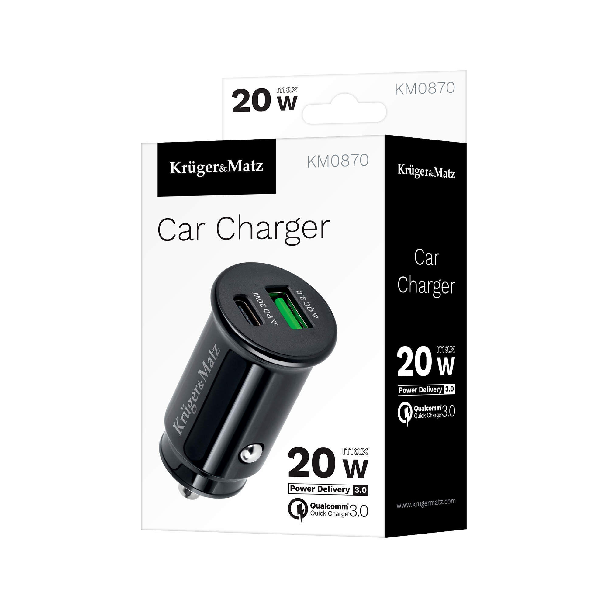 Ładowarka samochodowa Kruger&Matz z funkcją szybkiego ładowaniaŁadowarka samochodowa Kruger&Matz KM0870 to akcesorium, które powinno znaleźć się w każdym aucie. Ten wydajny model o mocy 20 W został wyposażony w port USB-A oraz USB-C, dzięki czemu może w jednym czasie ładować dwa urządzenia.