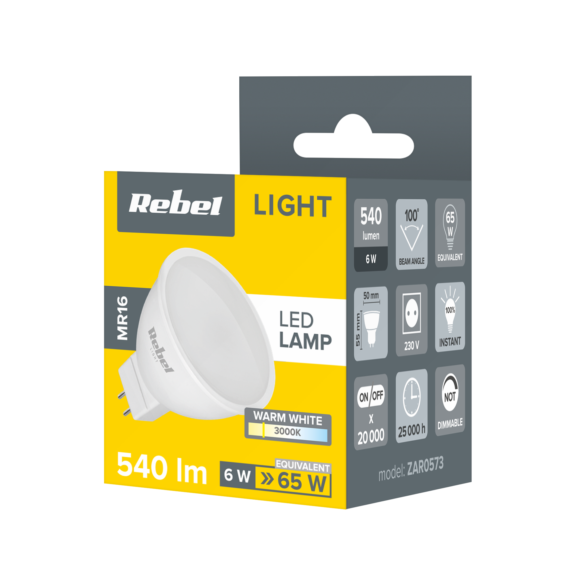 Lampa LED Rebel 6W, MR16, 3000K, 230VOferujemy nowoczesną lampę LED Rebel o mocy 6 W, idealną do zastosowań wymagających efektywnego i oszczędnego oświetlenia. Dzięki zastosowaniu technologii LED, lampa stanowi doskonałe rozwiązanie dla osób poszukujących wydajnego oświetlenia w atrakcyjnej formie.