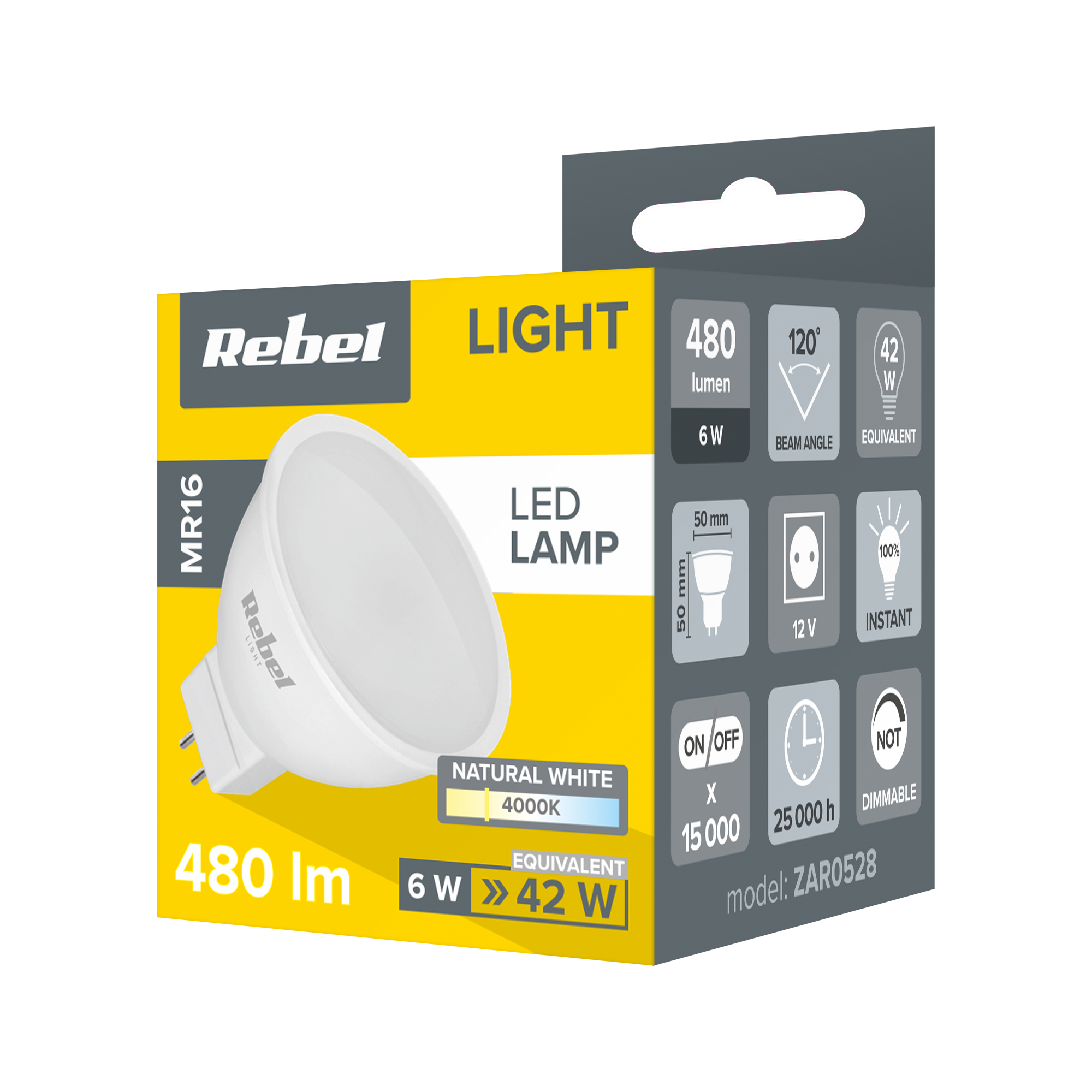 Lampa LED Rebel 6W MR16, 3000K, 12VLampa LED Rebel o mocy 6W z trzonkiem MR16 to energooszczędne i wydajne źródło światła, idealne do zastosowania w oprawach oświetleniowych typu reflektor. Dzięki ciepłemu białemu światłu o temperaturze 3000K, lampa ta tworzy przyjemną i komfortową atmosferę w każdym pomieszczeniu.