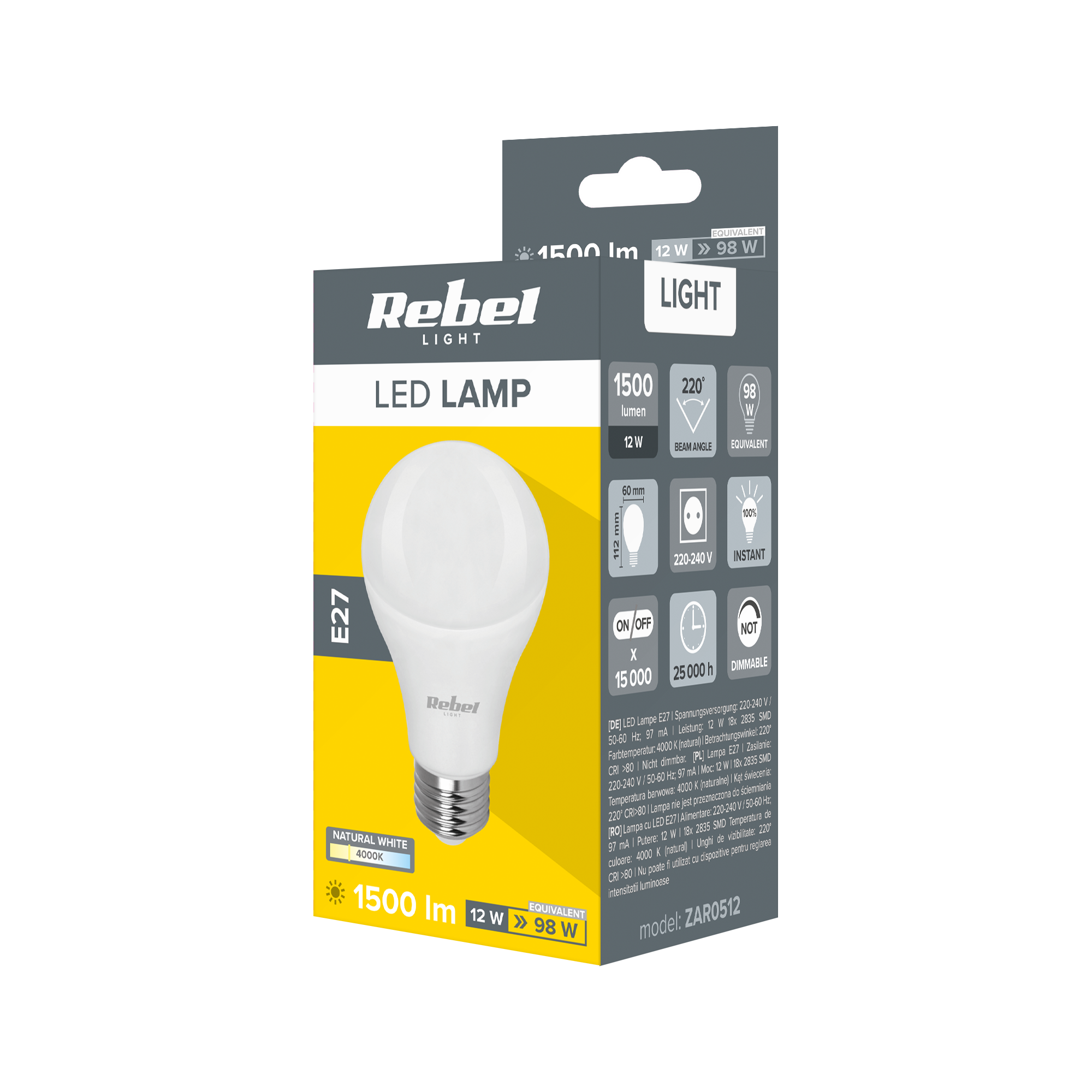 Lampa LED RebelŻarówka LED o mocy 12 W i 1500 lm z serii Rebel to gwarancja wysokiej wydajności i niskiego zużycia energii. Charakteryzuje się długą żywotnością oraz szerokim, 220-stopniowym kątem świecenia w naturalnym kolorze. Lampa LED marki Rebel zalicza się do klasy energetycznej E i jest zgodna z ostatnimi rozporządzeniami Komisji Europejskiej dotyczącymi etykietowania energetycznego źródeł światła oraz wymogów dotyczących ekoprojektu dla źródeł światła.