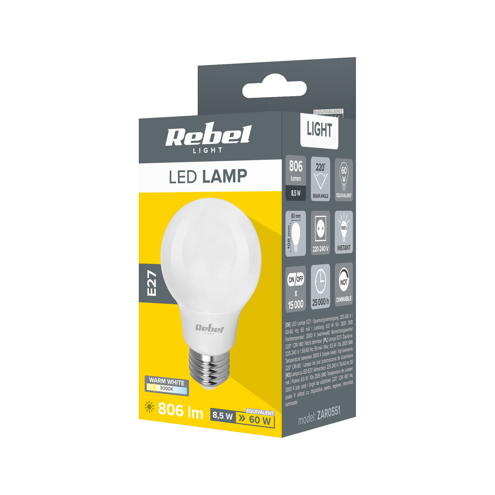 Lampa LED Rebel A60 8,5W, 3000K, 230VLampa LED Rebel A60 o mocy 8,5 W to wszechstronne źródło światła, które łączy nowoczesną technologię z efektywnością energetyczną. Jest idealnym rozwiązaniem dla osób poszukujących wysokiej jakości oświetlenia do różnych przestrzeni mieszkalnych i roboczych.