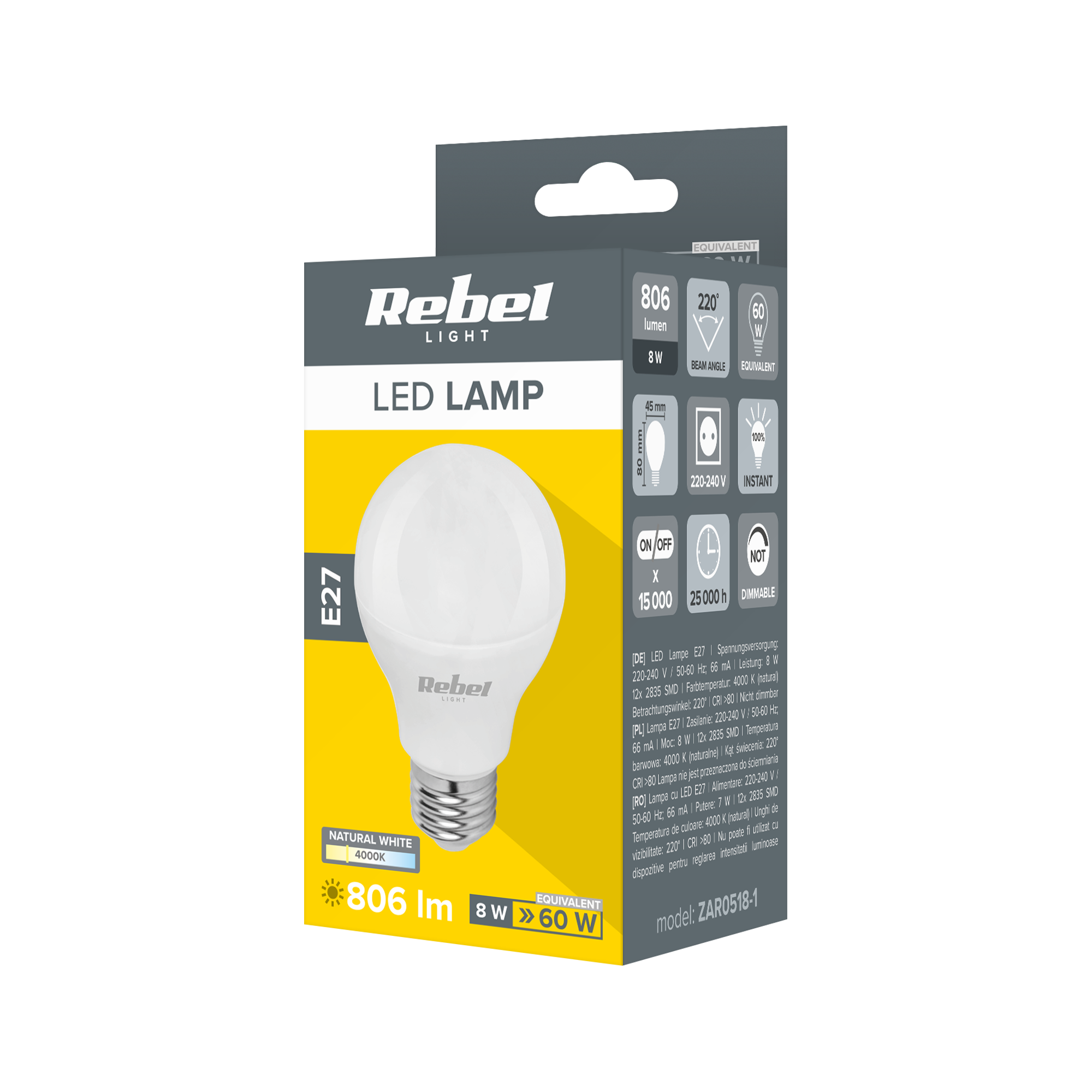 Ekologiczne i bezpieczneBez zawartości rtęci (0 mg), lampa LED Rebel jest bezpieczna dla środowiska. Jej trzonek E27 oraz napięcie 220 - 240 V zapewniają łatwe dopasowanie do standardowych opraw oświetleniowych. Produkt objęty jest 6-miesięczną gwarancją, co dodatkowo potwierdza jego wysoką jakość i niezawodność.