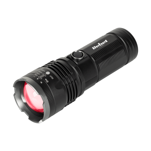 Latarka LED z ruchomą głowicą Rebel 1200 mAh 250m IPX5 aluminiumLatarka LED Rebel to wszechstronne urządzenie wyposażone w ruchomą głowicę i obrotową rękojeść, co zapewnia maksymalną wygodę użytkowania. Wykonana z trwałego aluminium, latarka jest solidna i odporna na uszkodzenia.