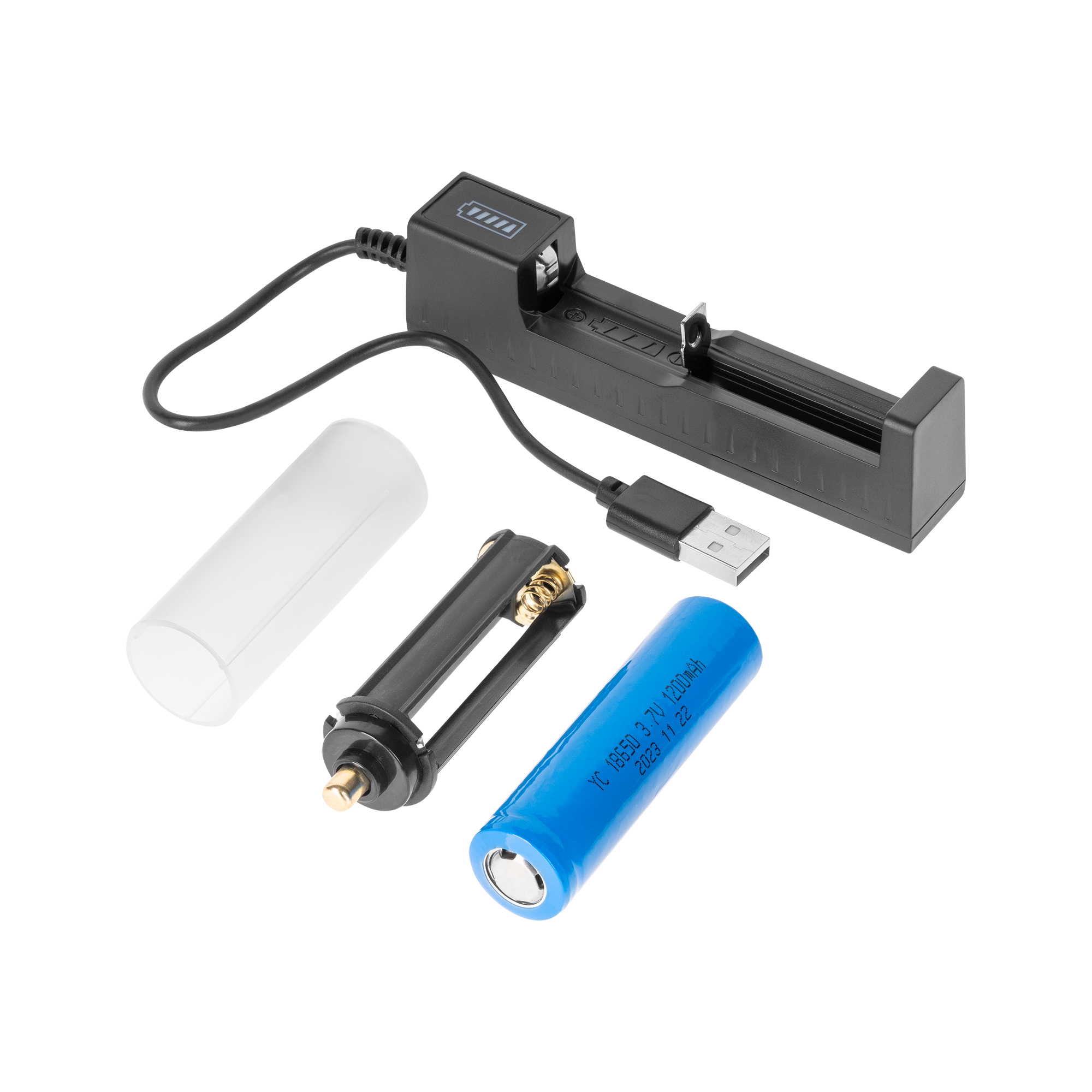 W zestawie: ładowarka USB, bateria 18650, adapter do baterii 18650