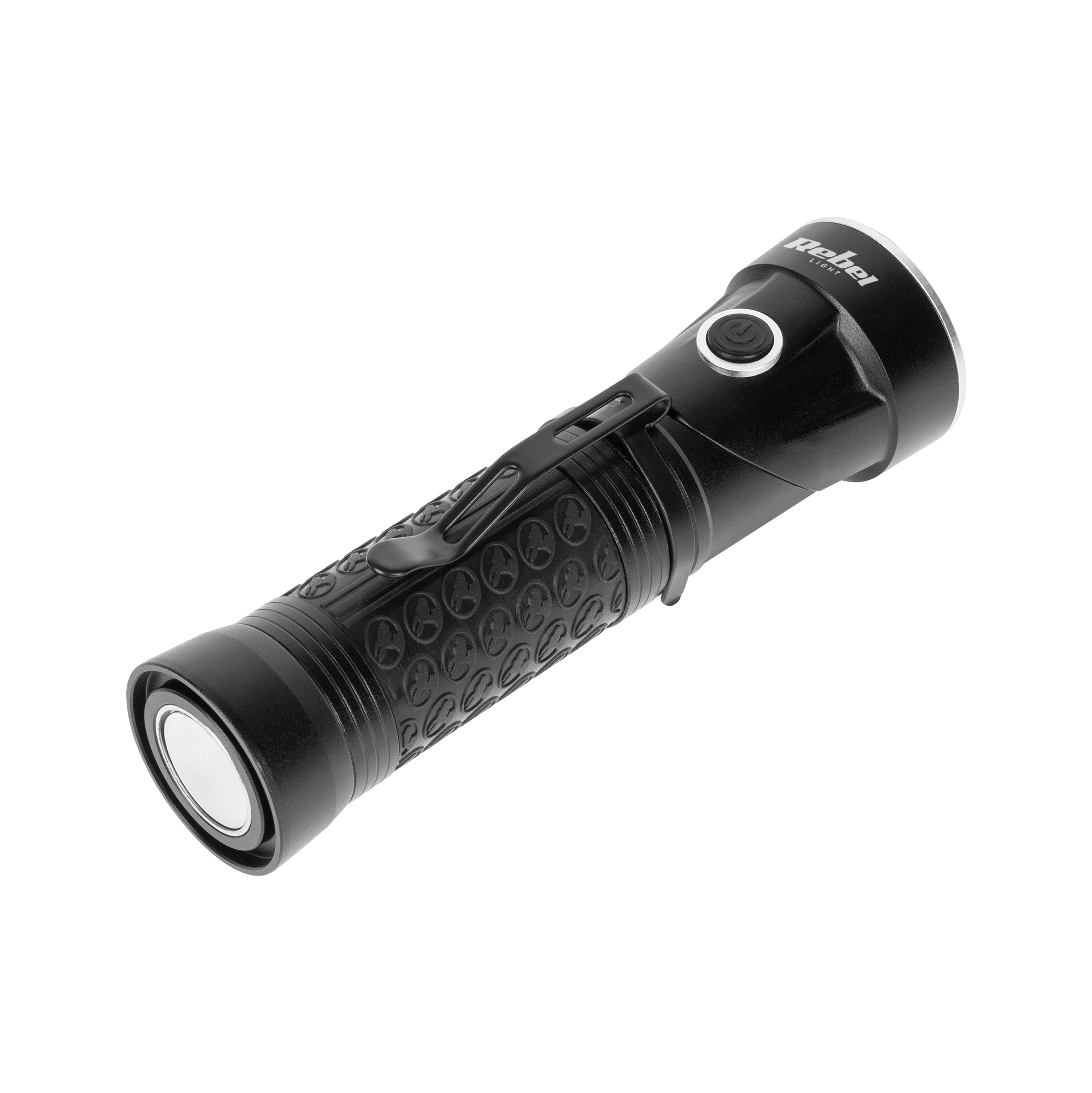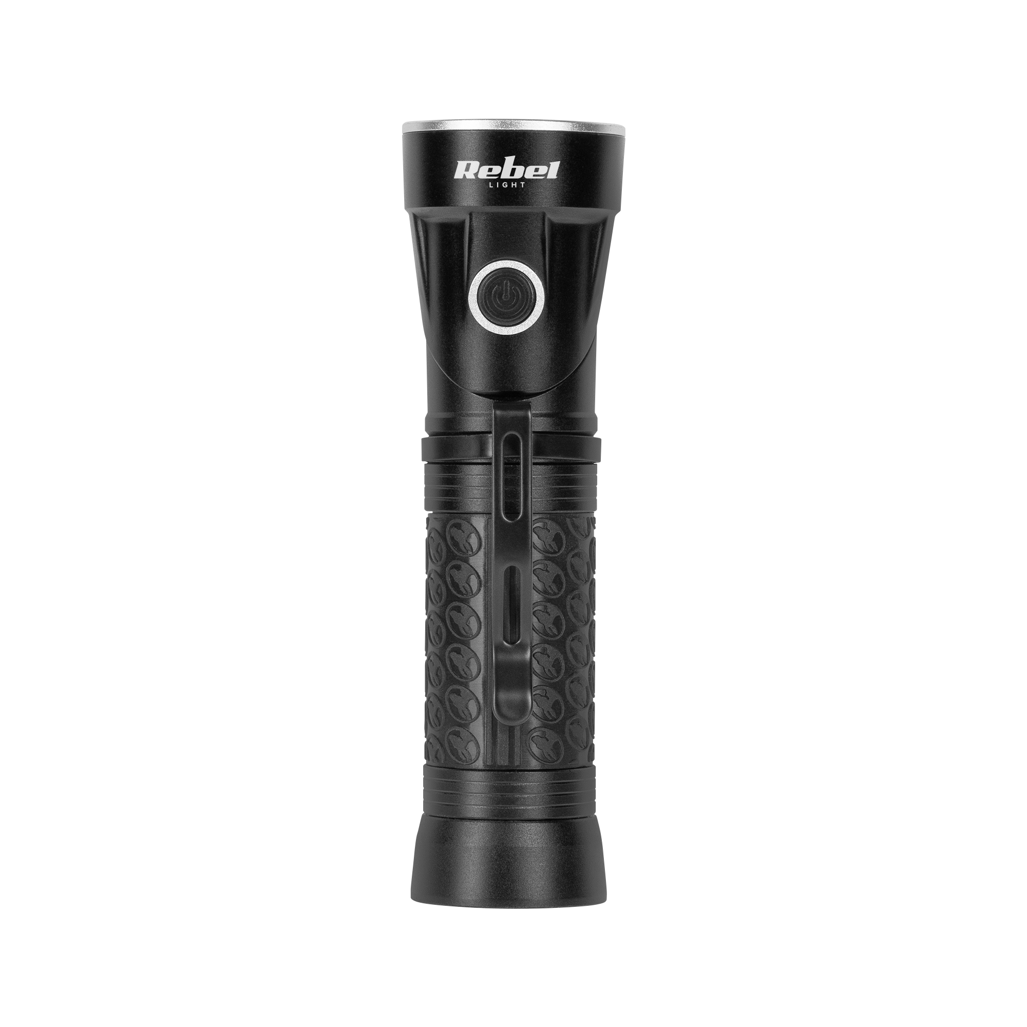 Latarka LED z ruchomą głowicą Rebel 1200 mAh 250m IPX5 aluminiumLatarka LED Rebel to wszechstronne urządzenie wyposażone w ruchomą głowicę i obrotową rękojeść, co zapewnia maksymalną wygodę użytkowania. Wykonana z trwałego aluminium, latarka jest solidna i odporna na uszkodzenia.