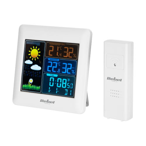 Bezprzewodowa stacja pogodowa z czujnikiem zewnętrznymStacja pogodowa Rebel to doskonałe urządzenie, które pozwala na precyzyjne monitorowanie warunków atmosferycznych w Twoim domu i na zewnątrz. Dzięki zaawansowanym funkcjom, takim jak pomiar temperatury, wilgotności, ciśnienia atmosferycznego oraz prognoza pogody, zapewnia pełną kontrolę nad aktualnymi warunkami.