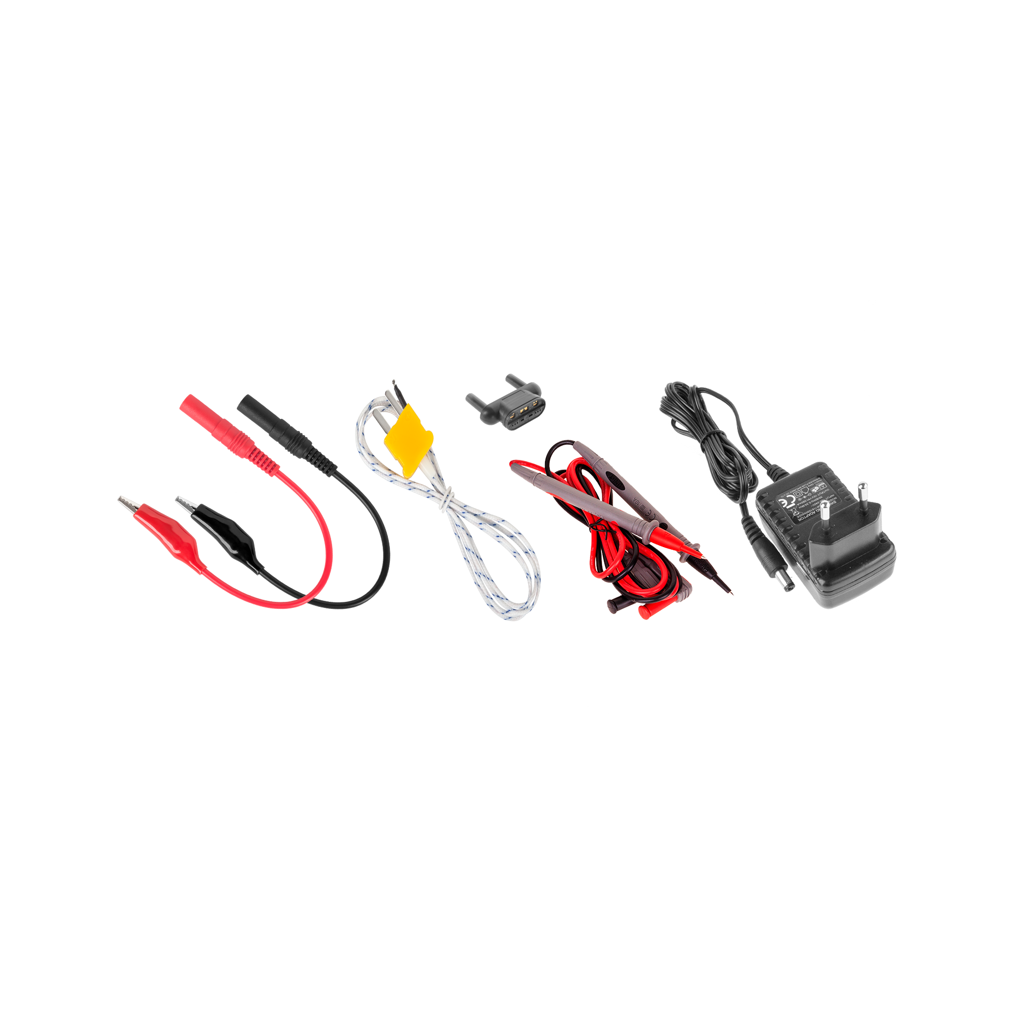 Akcesoria: przewody pomiarowe, krótkie przewody z krokodylkami, sonda pomiaru temperatury, gniazdo pomiarowe, zasilacz sieciowy