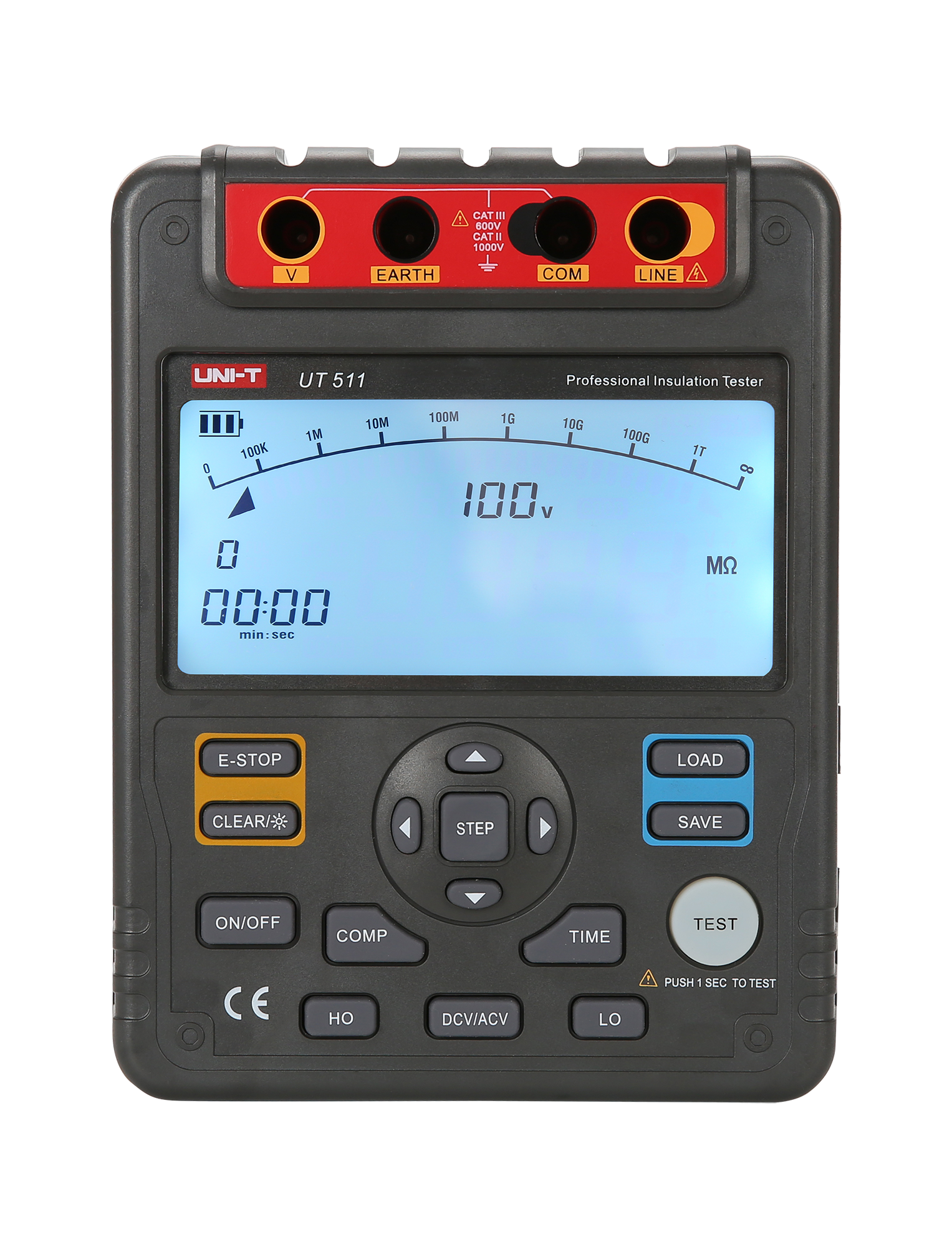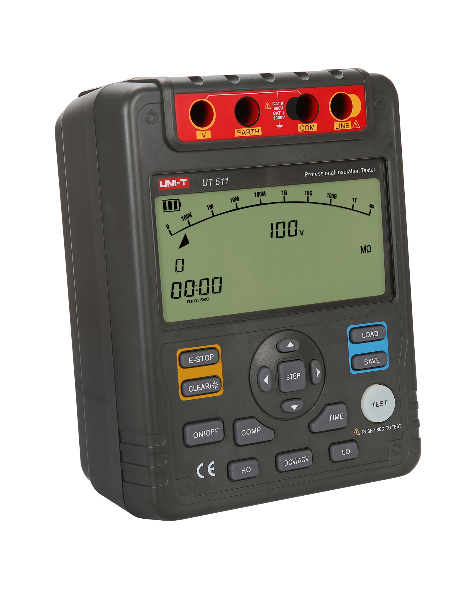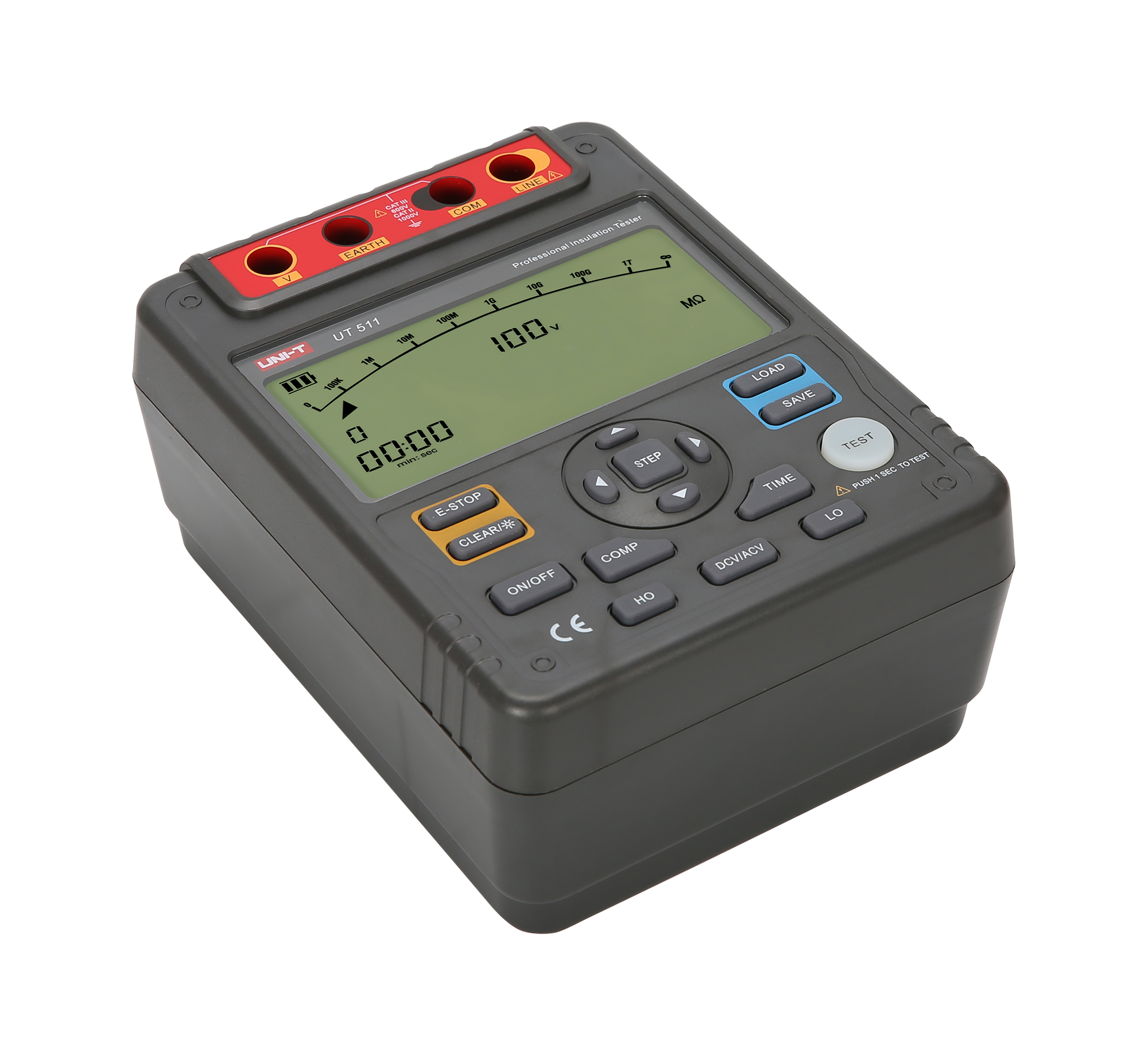 Funkcje diagnostyczne i bezpieczeństwoUT511 jest wyposażony w szereg funkcji diagnostycznych, takich jak test absorpcji dielektrycznej, indeksacja polaryzacji oraz funkcja porównawcza, które umożliwiają kompleksową ocenę stanu izolacji. Miernik posiada również funkcję automatycznej zmiany zakresów pomiarowych, wskaźnik niskiego poziomu baterii oraz ostrzeżenie o wysokim napięciu, co zwiększa bezpieczeństwo i wygodę użytkowania. Dodatkowo, podświetlany ekran LCD o wymiarach 123 x 58 mm oraz analogowy bargraf z 30 segmentami ułatwiają odczyt wyników w różnych warunkach oświetleniowych.