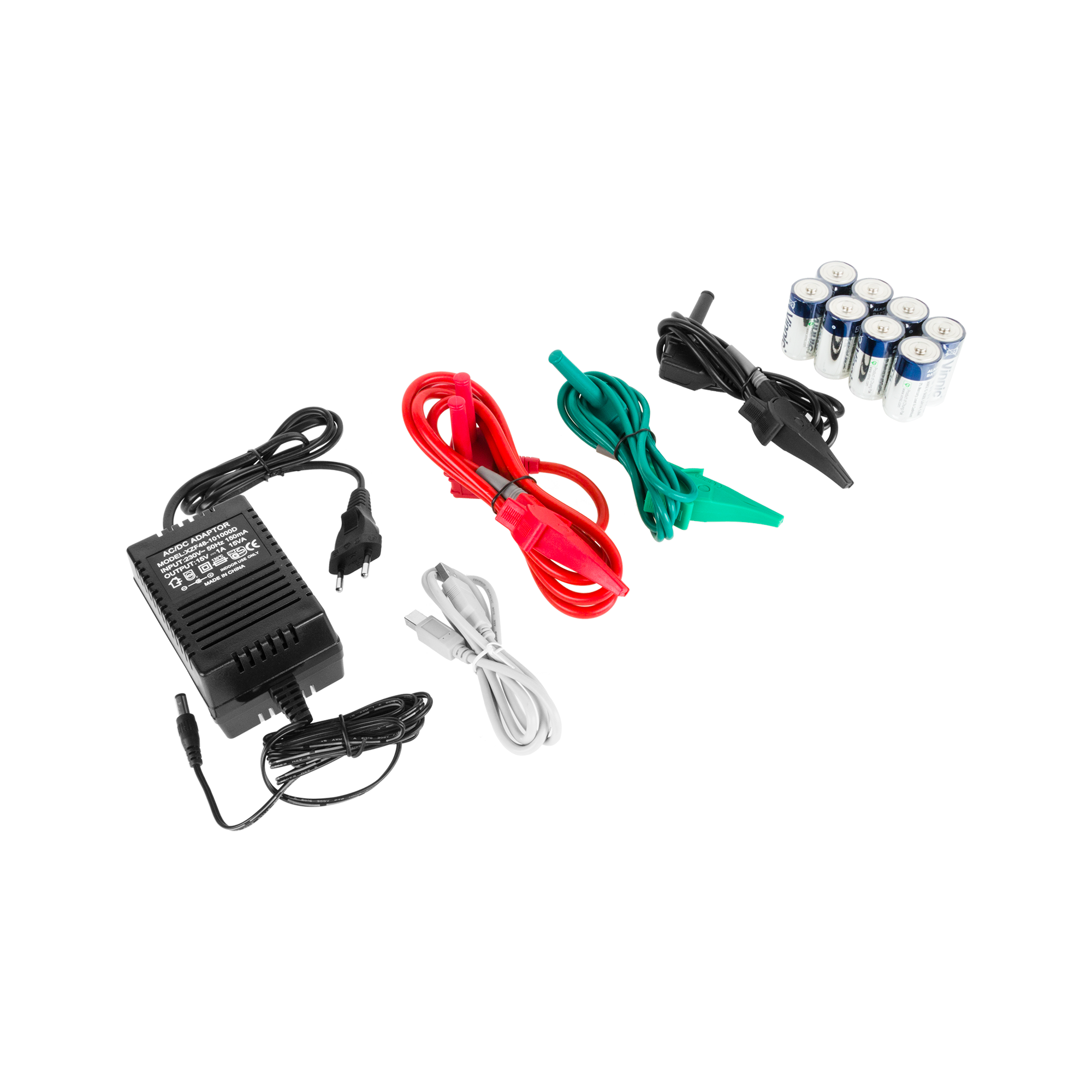 W zestawie: specjalne przewody pomiarowe z krokodylkami, przewód USB, zasilacz zewnętrzny, baterie, etui