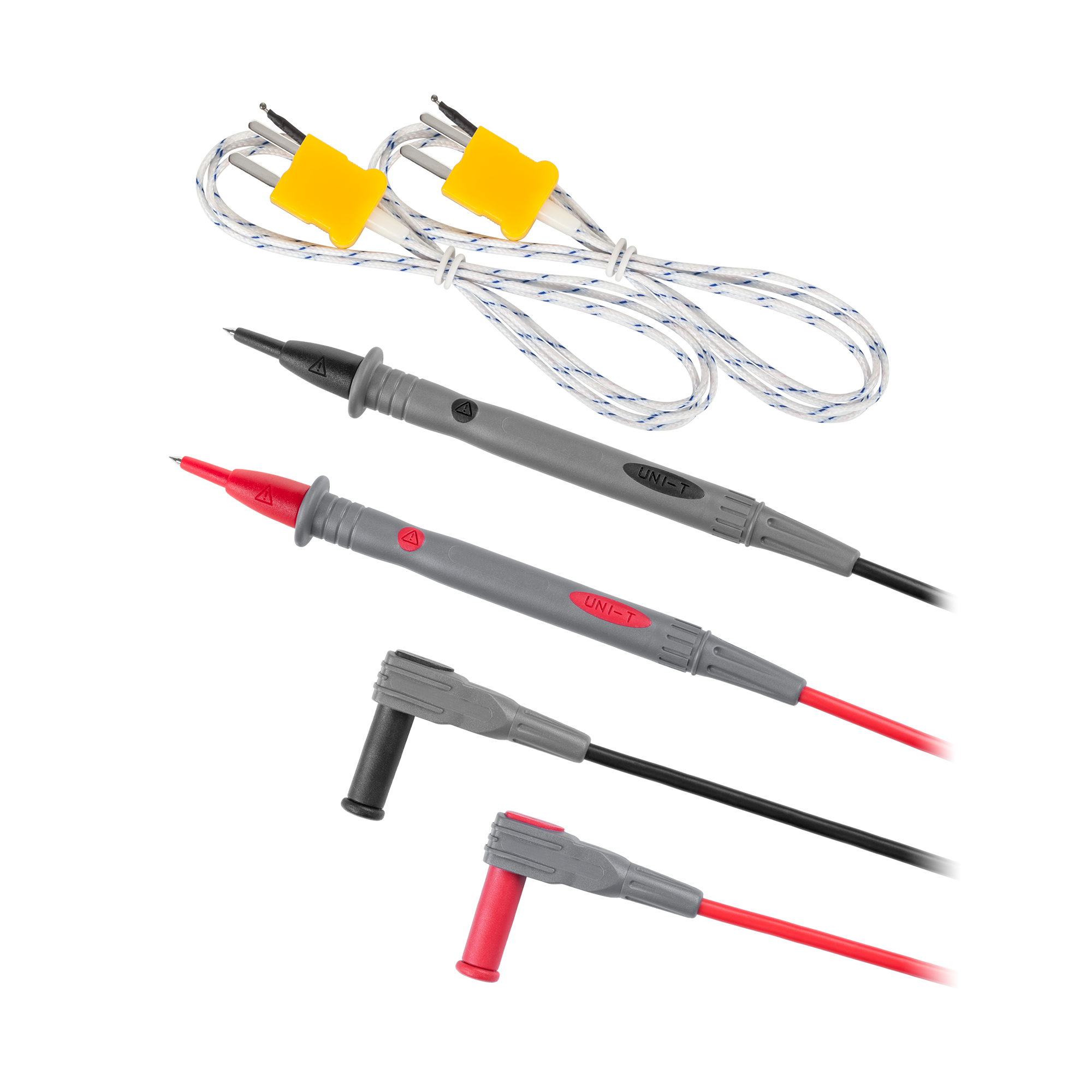 Akcesoria: akumulator, przewody pomiarowe, przewód USB, 2x sonda pomiaru temperatury, gniazdo pomiarowe temperatury, gniazdo ładowania, zasilacz sieciowy, etui