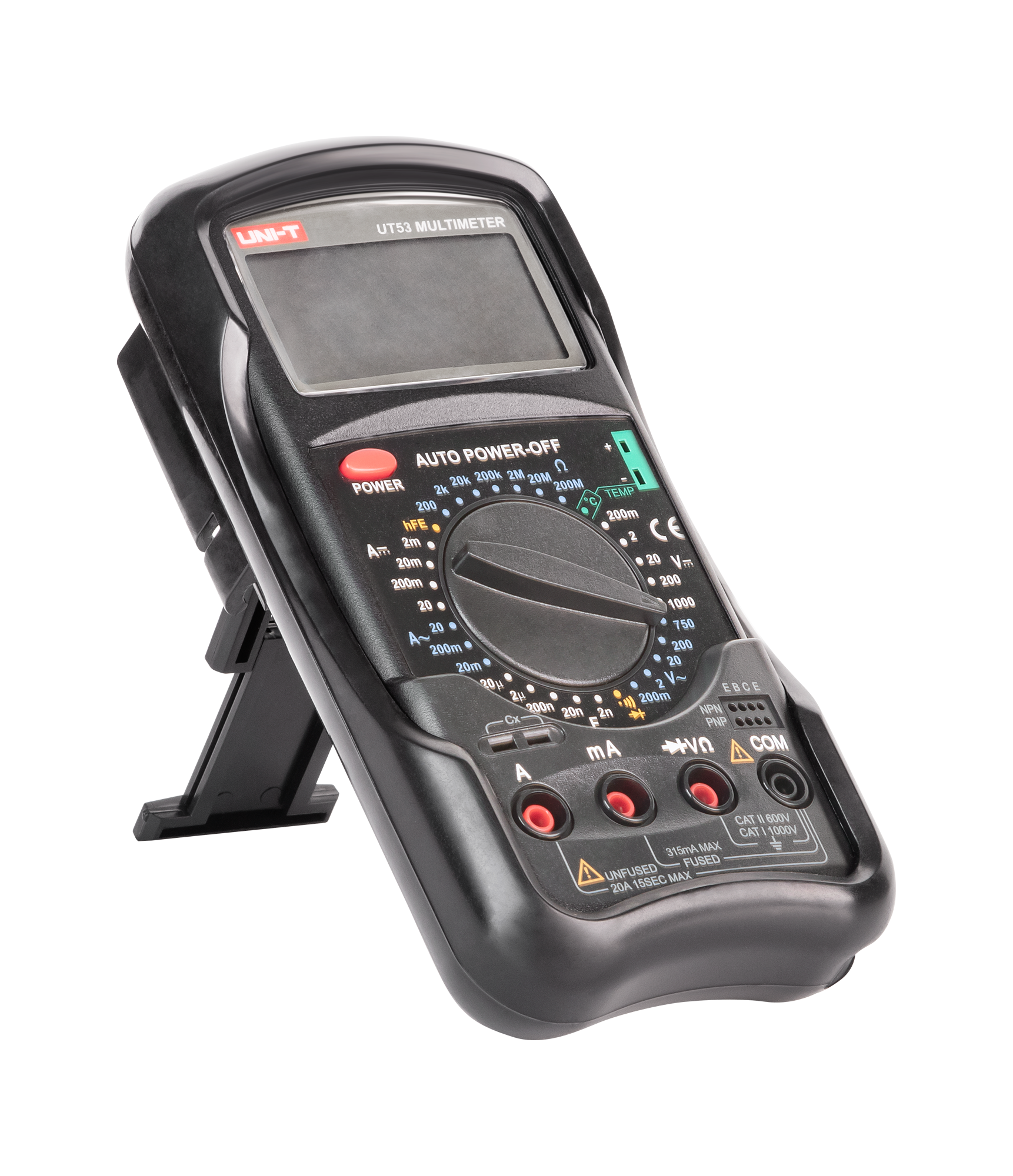 Miernik uniwersalny UT53Miernik Uni-T UT53 to solidne i wszechstronne narzędzie pomiarowe, idealne do szerokiego zakresu zastosowań w elektronice i elektrotechnice. Dzięki zaawansowanym funkcjom oraz dokładnym pomiarom, UT53 sprawdzi się zarówno w profesjonalnych pracach serwisowych, jak i w domowych warsztatach.