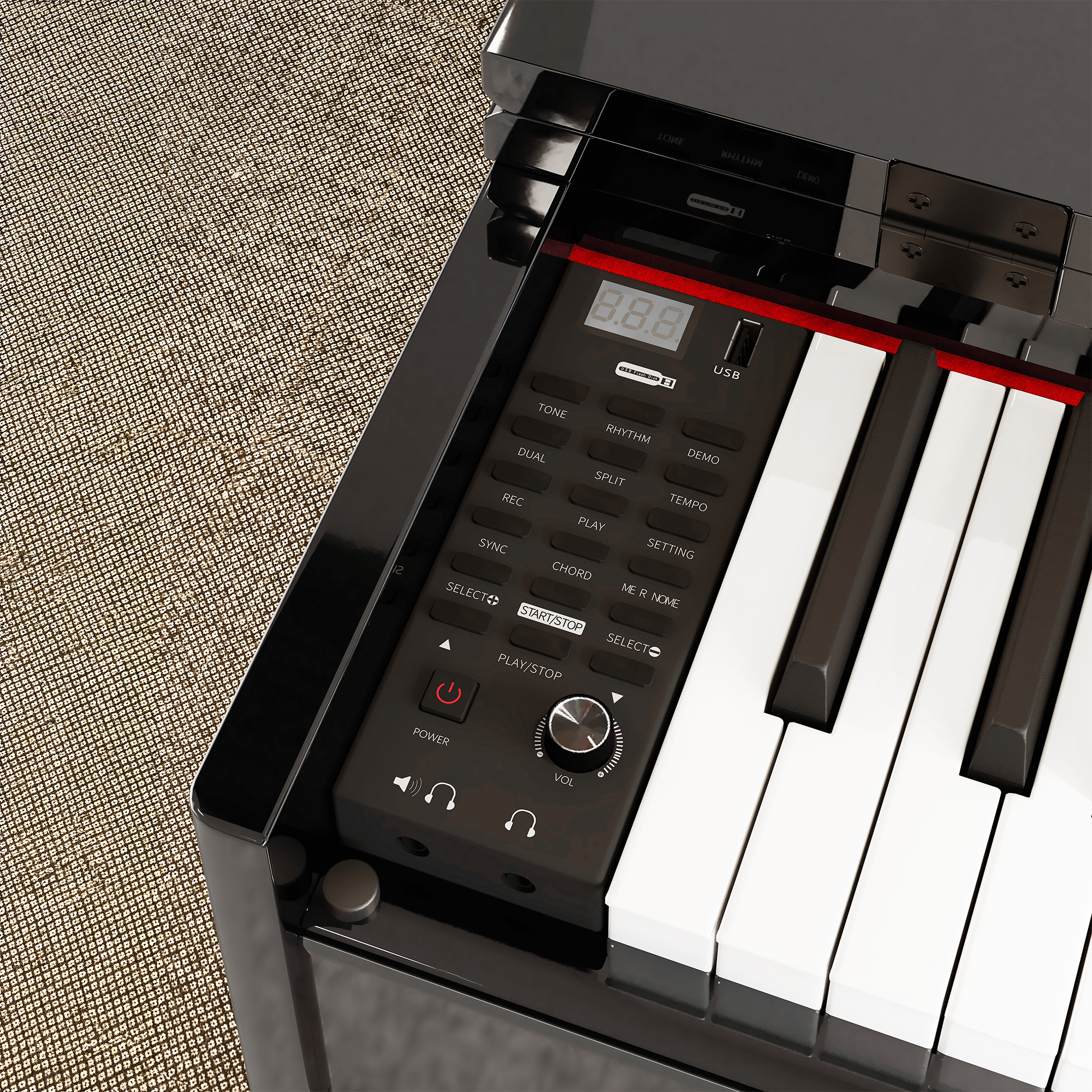 Dla większej ekspresjiImponującą głośność i krystalicznie czysty dźwięk, idealny zarówno do domowego użytku, jak i na mniejsze występy, gwarantuje moc urządzenia na poziomie 25 W. Z kolei zaawansowaną kontrolę nad dźwiękiem i dynamiką gry umożliwiają trzy pedały (sustain, soft, sostenuto).