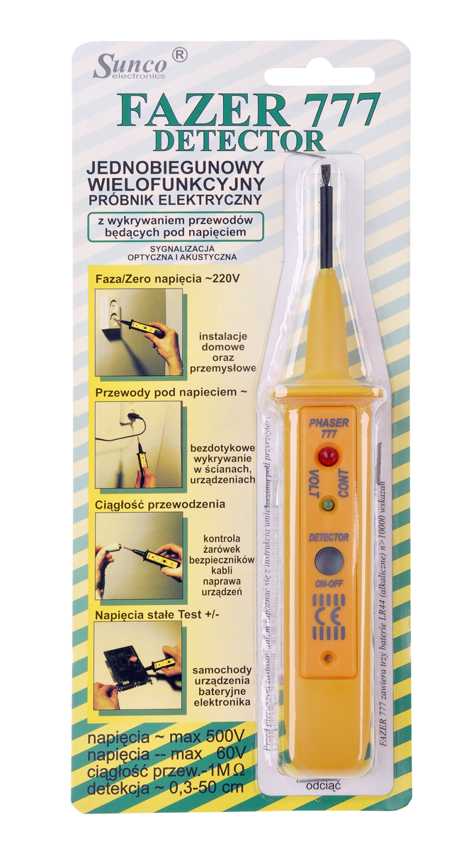 Przyrząd do wykrywania napięcia elektrycznego - Próbnik elektryczny Fazer 777 Detector. Doskonałe narzędzie do bezdotykowego wykrywania przewodów pod napięciem w zakresie od 0,3 cm do 50 cm. Możliwość wykrywania fazy/zera przemiennego do maksymalnie 500 V, testowania ciągłości przewodzenia na poziomie około 1 MOhm oraz wykrywania napięć stałych do maksymalnie 60 V. Dzięki zaawansowanej technologii i precyzyjnemu działaniu, produkt ten sprawdzi się doskonale w profesjonalnych zastosowaniach elektrycznych.