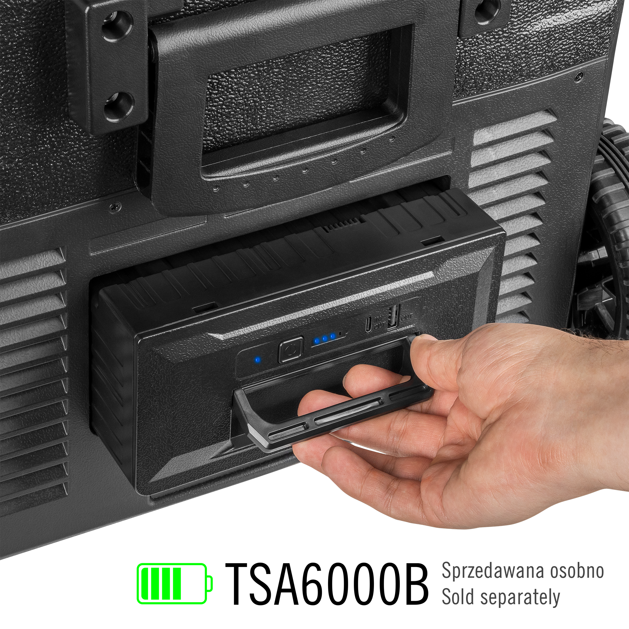Zasilanie baterią zewnętrznąLodówka może być zasilana nie tylko standardowo z gniazda zapalniczki samochodowej czy sieci 230 V, ale także z zewnętrznej baterii (sprzedawanej oddzielnie). Takie rozwiązanie zwiększa mobilność, pozwala na chłodzenie w miejscach bez stałego źródła energii i zapewnia niezależność od pojazdu lub sieci elektrycznej podczas kempingu.