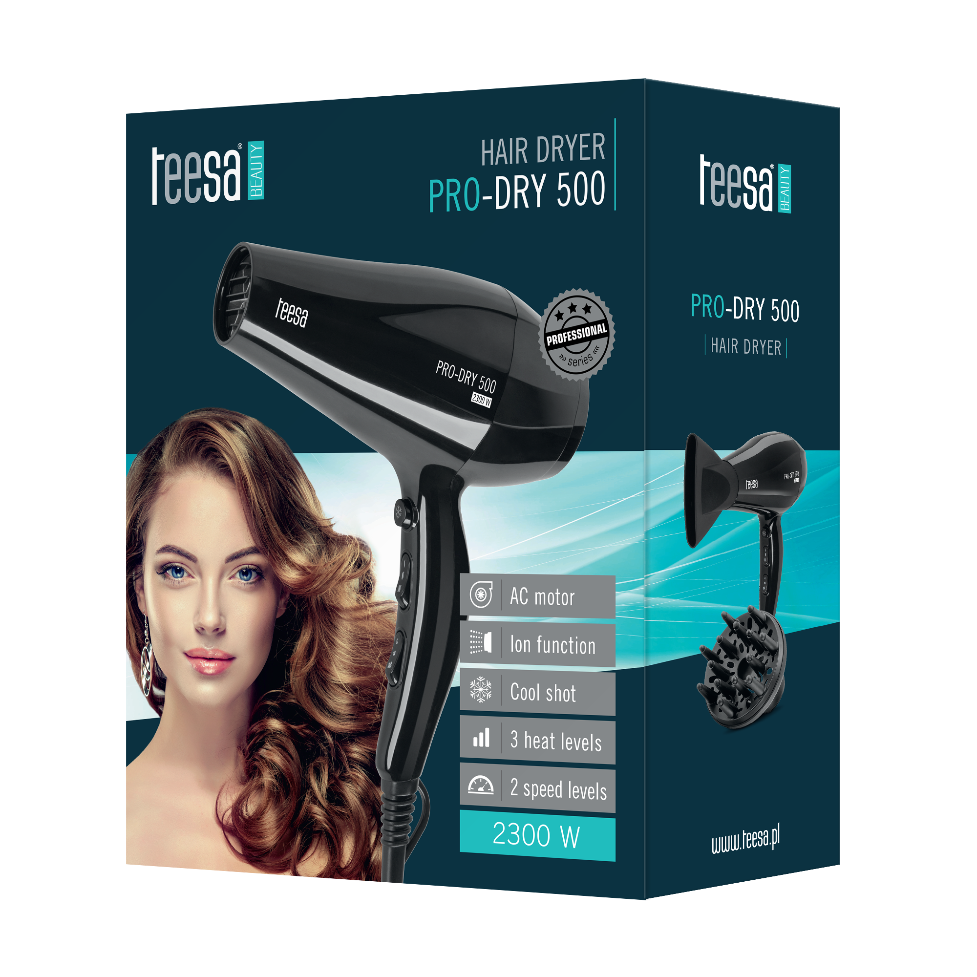 Suszarka Teesa PRO-DRY - 2300W, Jonizacja i Szybkie Suszenie!Suszarka Teesa PRO-DRY z silnikiem AC o mocy do 2300 W gwarantuje szybkie i efektowne suszenie nawet najbardziej niesfornych kosmyków. Dzięki funkcji jonizacji włosy nie elektryzują się, są bardziej wygładzone i wyglądają zdrowo.