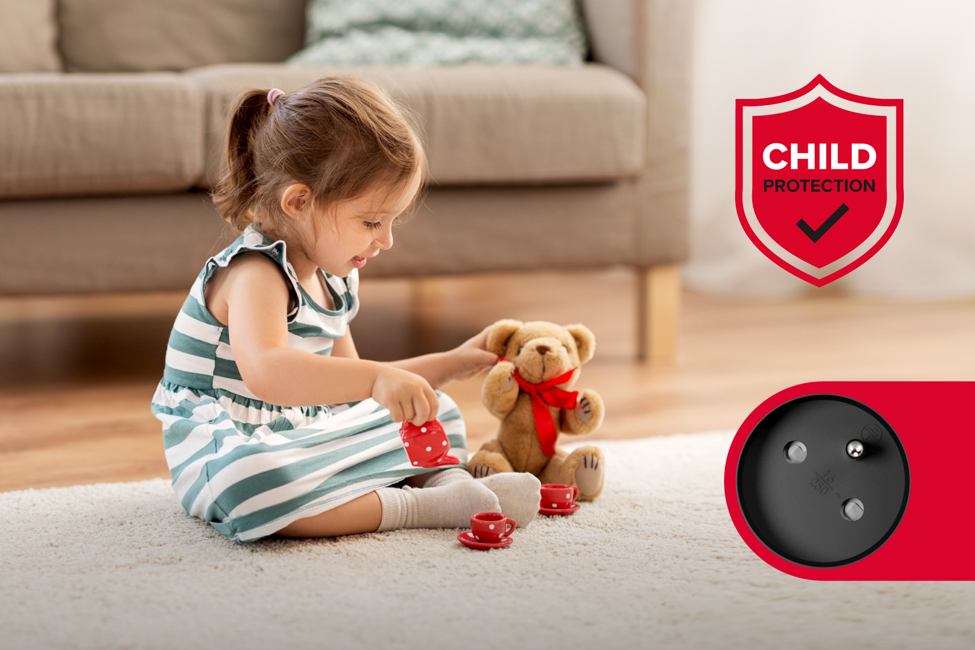Przedłużacz zasilający Rebel wyposażony został we wbudowane przesłony ochronne styków w gniazdach sieciowych. Dzięki temu skutecznie dba o zdrowie i życie najmłodszych, chroniąc ich przed wkładaniem palców lub innych przedmiotów.