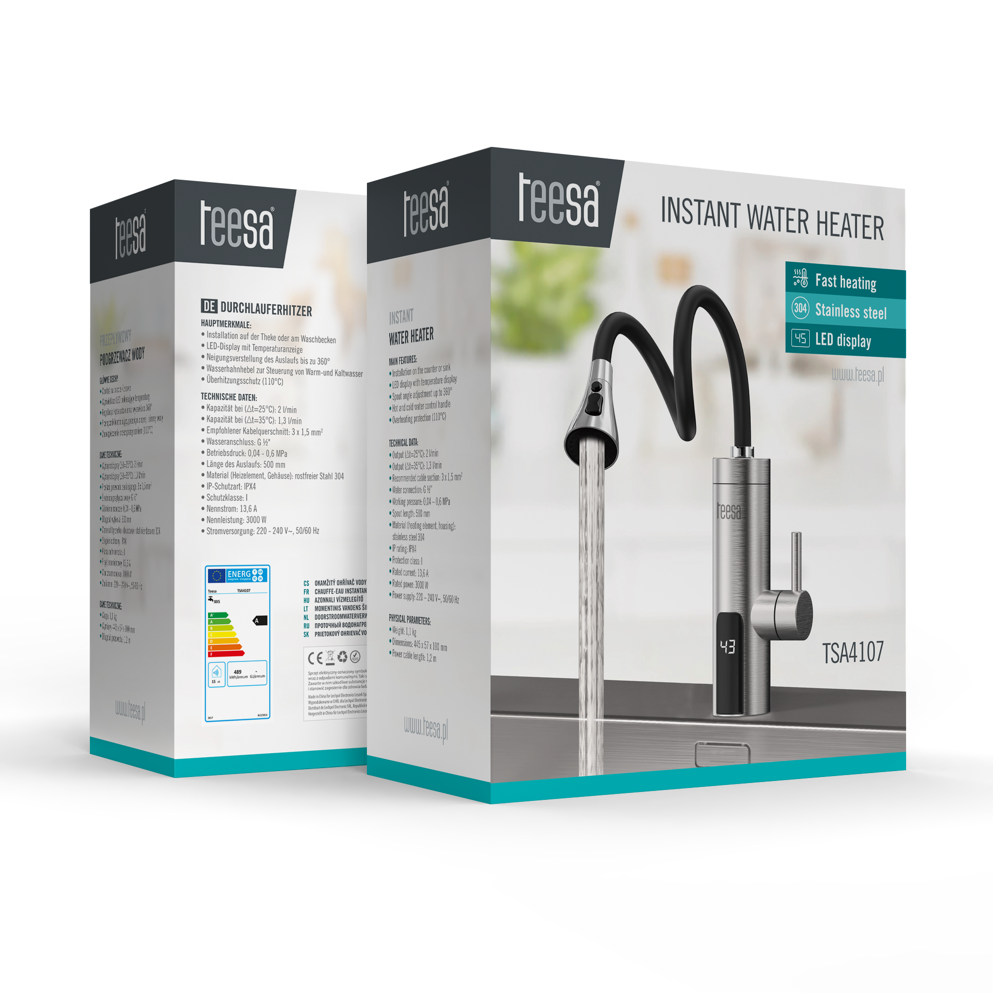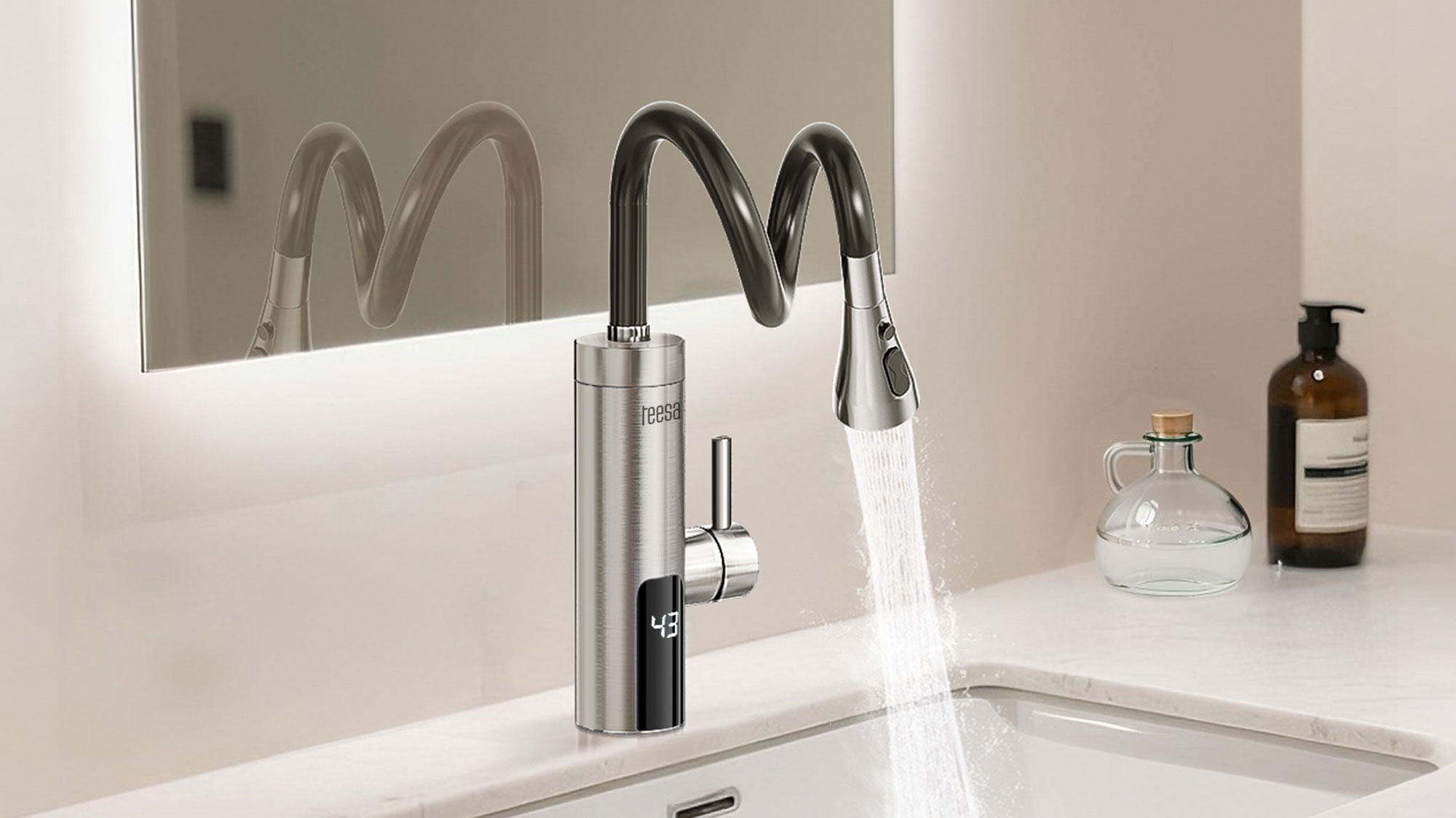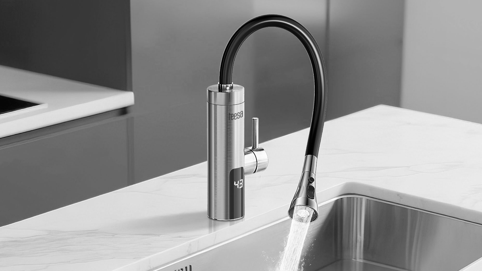 Przepływowy podgrzewacz wody z elastyczną wylewką TeesaPrzepływowy podgrzewacz wody Teesa to praktyczne rozwiązanie tam, gdzie liczy się mobilność, oszczędność i natychmiastowy dostęp do ciepłej wody. Idealny do kuchni, garaży, domków letniskowych i warsztatów. Zapewnia komfortowe użytkowanie bez bojlera i bez czekania, a kompaktowa konstrukcja umożliwia montaż niemal w dowolnym miejscu.