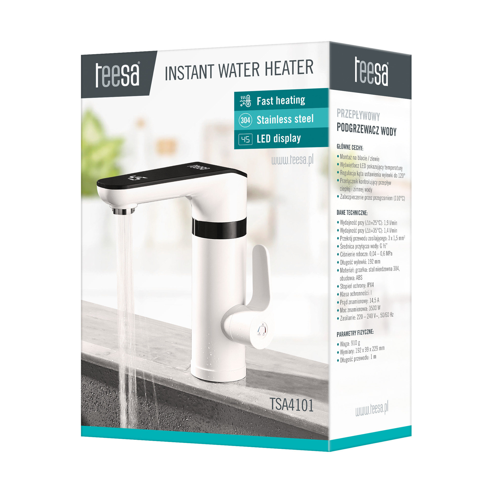Elektryczny przepływowy podgrzewacz wody TeesaPrzepływowy podgrzewacz Teesa sprawdzi się wszędzie tam, gdzie potrzebny jest szybki i wydajny dostęp do ciepłej wody bez konieczności stosowania dużych instalacji. Możesz wykorzystać go na działce, w domku letniskowym, garażu, a nawet w biurze. Urządzenie wyróżnia łatwy montaż na blacie lub zlewie, co umożliwia szybkie podłączenie do istniejącej instalacji wodnej i elektrycznej.