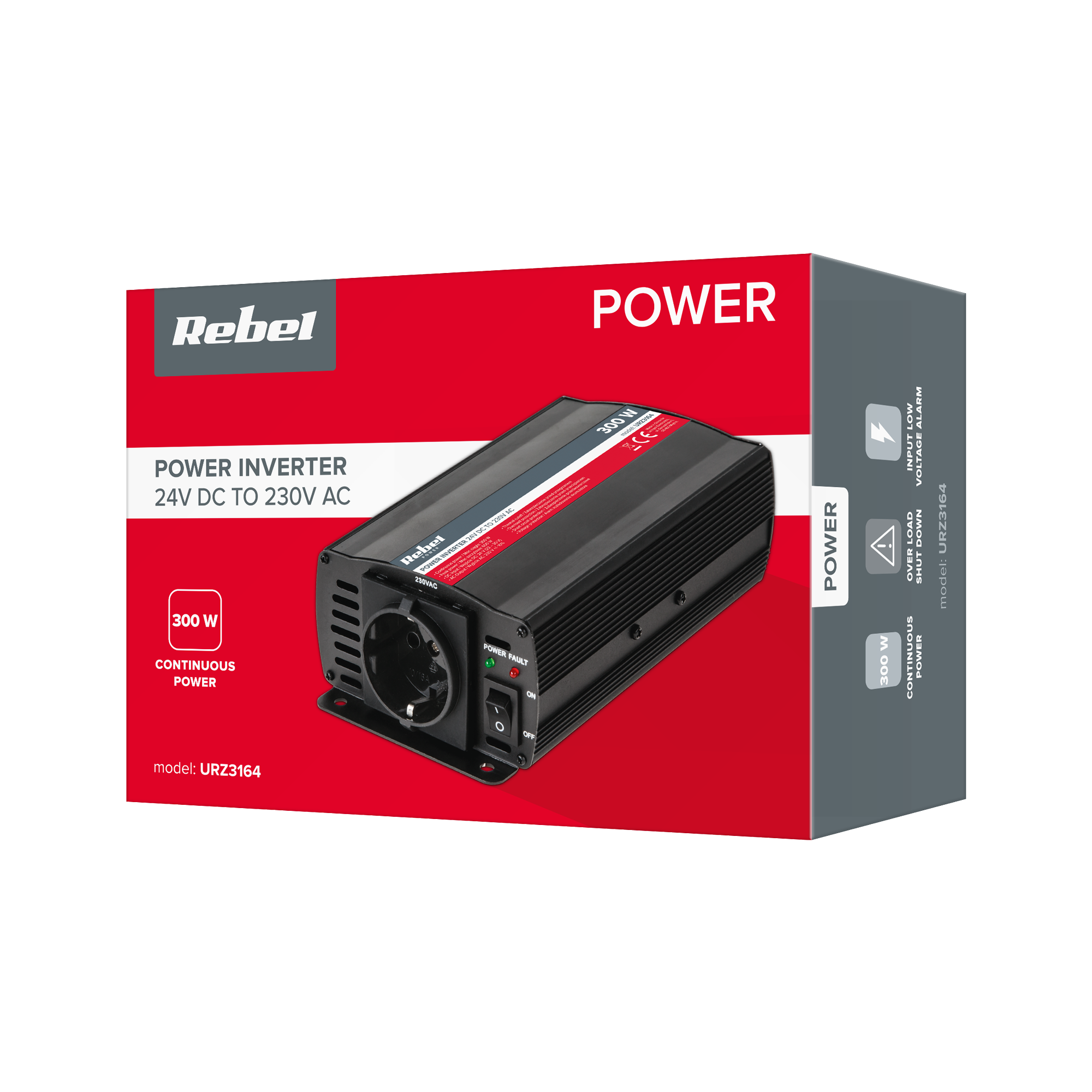 Przetwornica REBEL 24V/230V 300W (gn. typu F: niemieckie)Przetwornica REBEL 24V/230V o mocy 300W to niezawodne urządzenie zaprojektowane z myślą o zasilaniu sprzętu elektrycznego w pojazdach z instalacją 24V. Doskonale sprawdza się w ciężarówkach, kamperach i innych pojazdach, gdzie dostęp do standardowego napięcia 230V jest niezbędny podczas podróży.