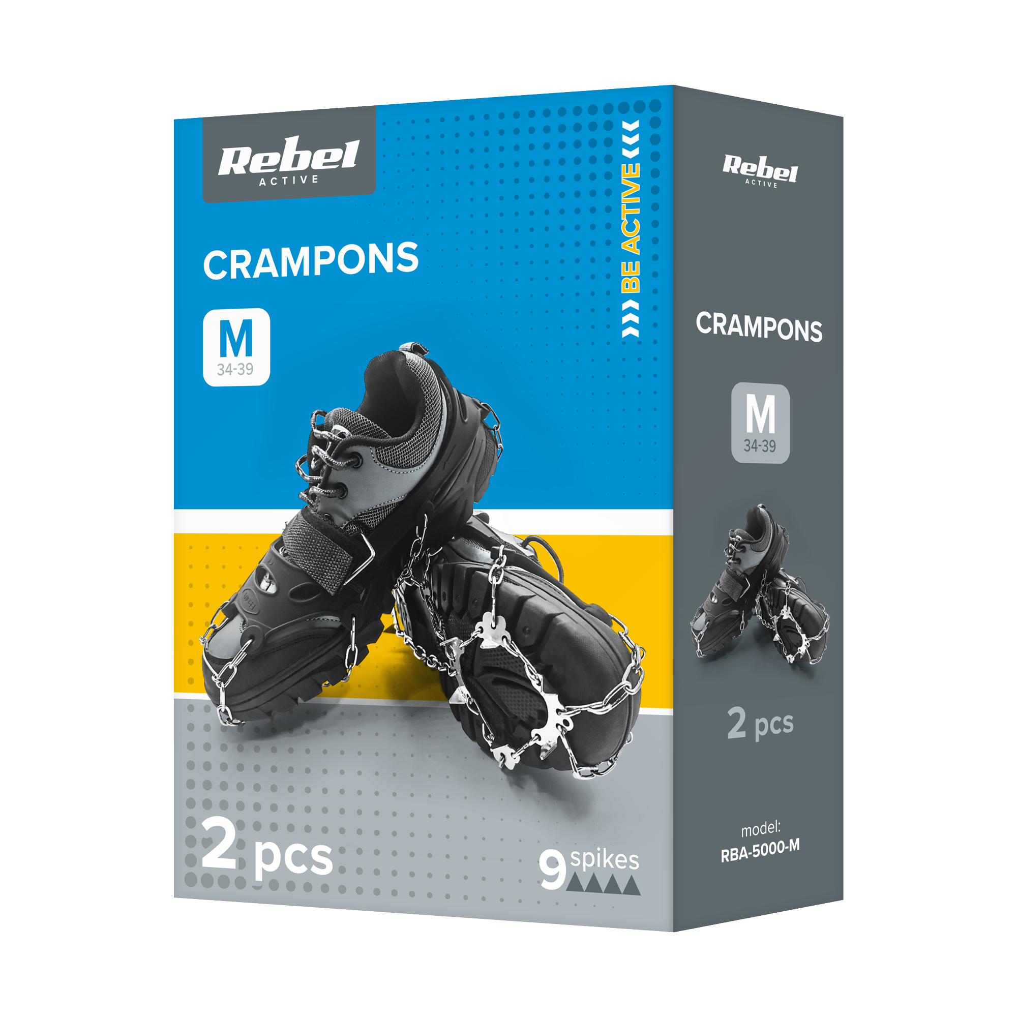 Raczki z kolcami na buty turystyczne, rozmiar M (36-40), REBEL ACTIVERaczki z kolcami REBEL ACTIVE to niezastąpione akcesorium dla turystów, którzy pragną zwiększyć swoje bezpieczeństwo podczas wędrówek w trudnych zimowych warunkach. Przeznaczone dla butów turystycznych w rozmiarze M (36-40), raczki zapewniają pewną przyczepność na śliskich nawierzchniach.