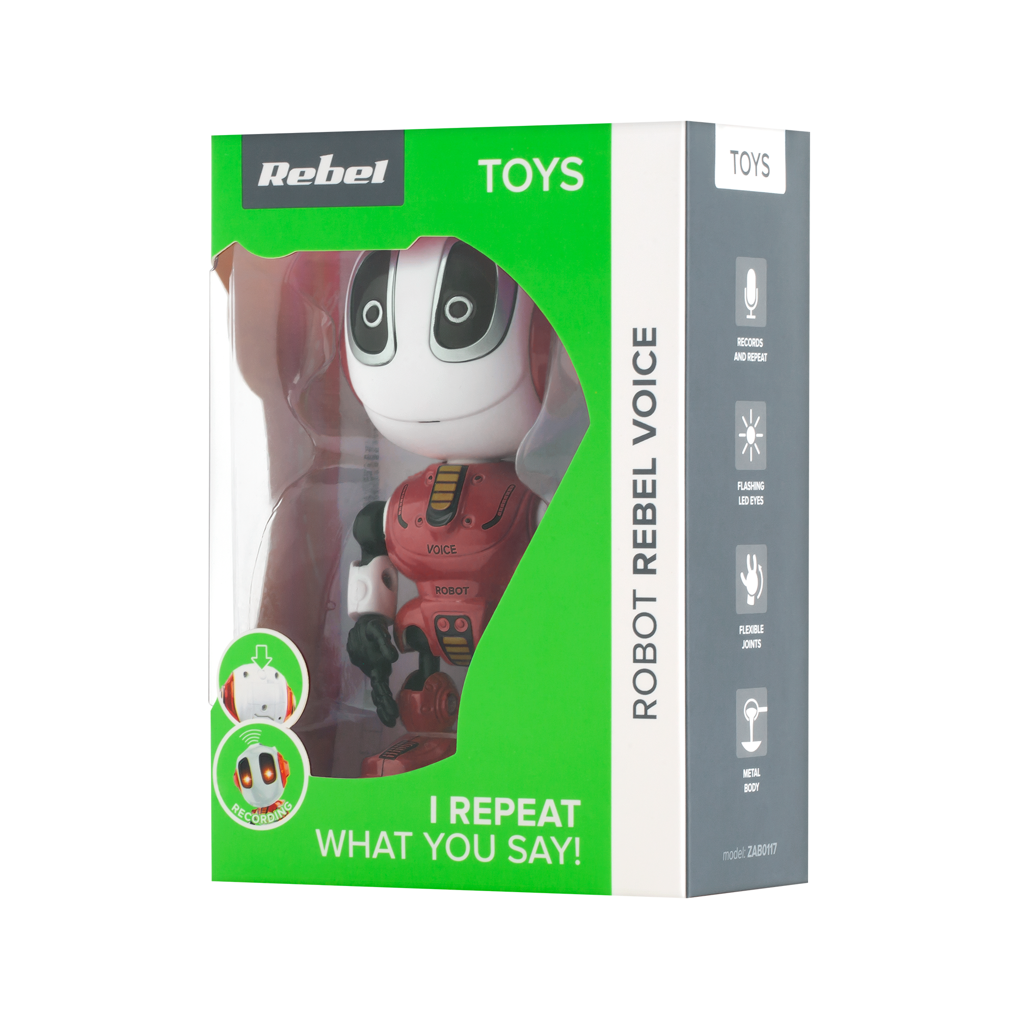 Robot Rebel VOICE RED Podaruj swojemu dziecku nowego przyjaciela! Rebel Voice to robot zabawka, która zapewnia kreatywną zabawę! Ta interaktywna zabawka potrafi słuchać, a następnie powtarza, to co usłyszy, śmiesznie zniekształcając głos. Dzięki temu doskonale rozwija wyobraźnię, a Twoje dziecko pokocha go od pierwszego słowa.