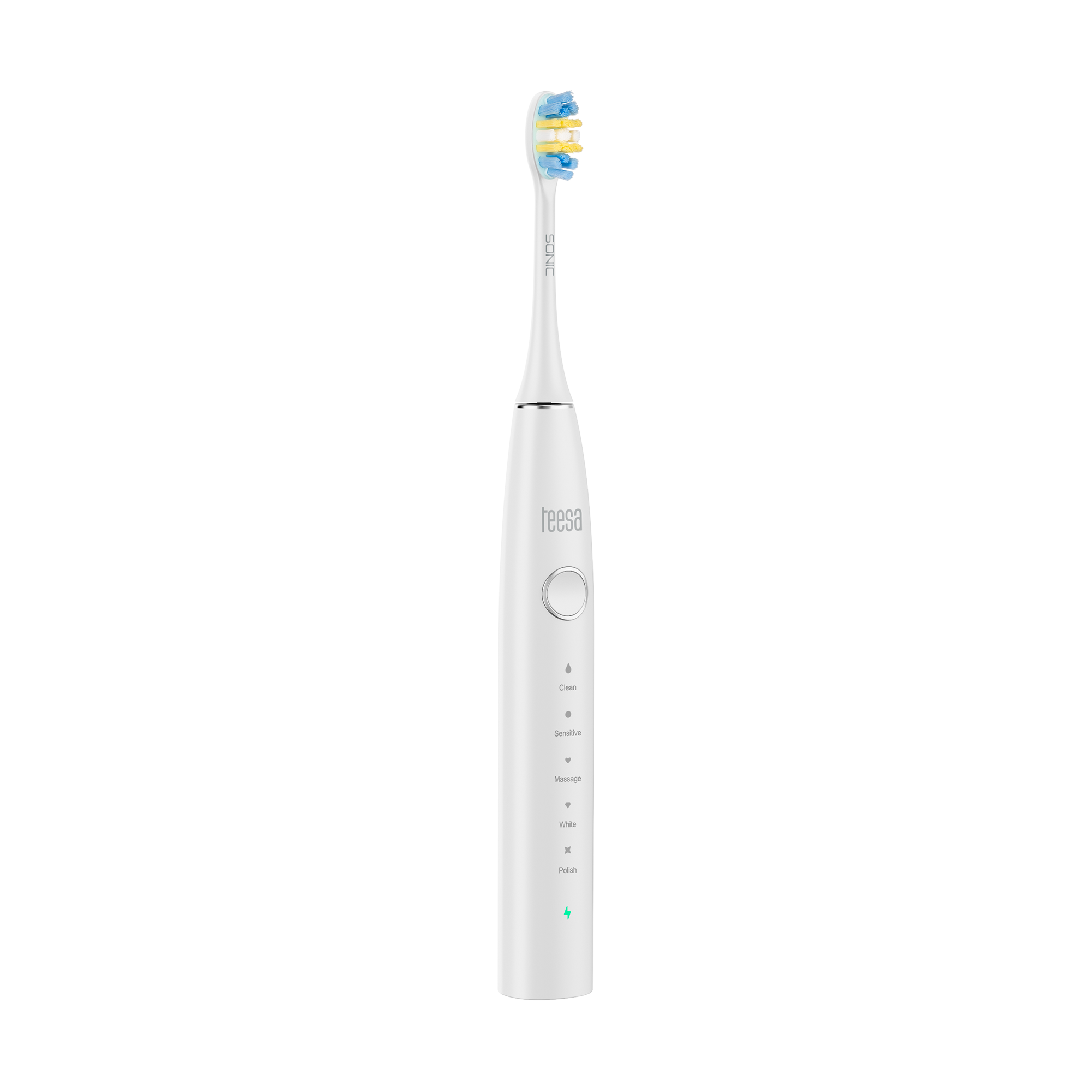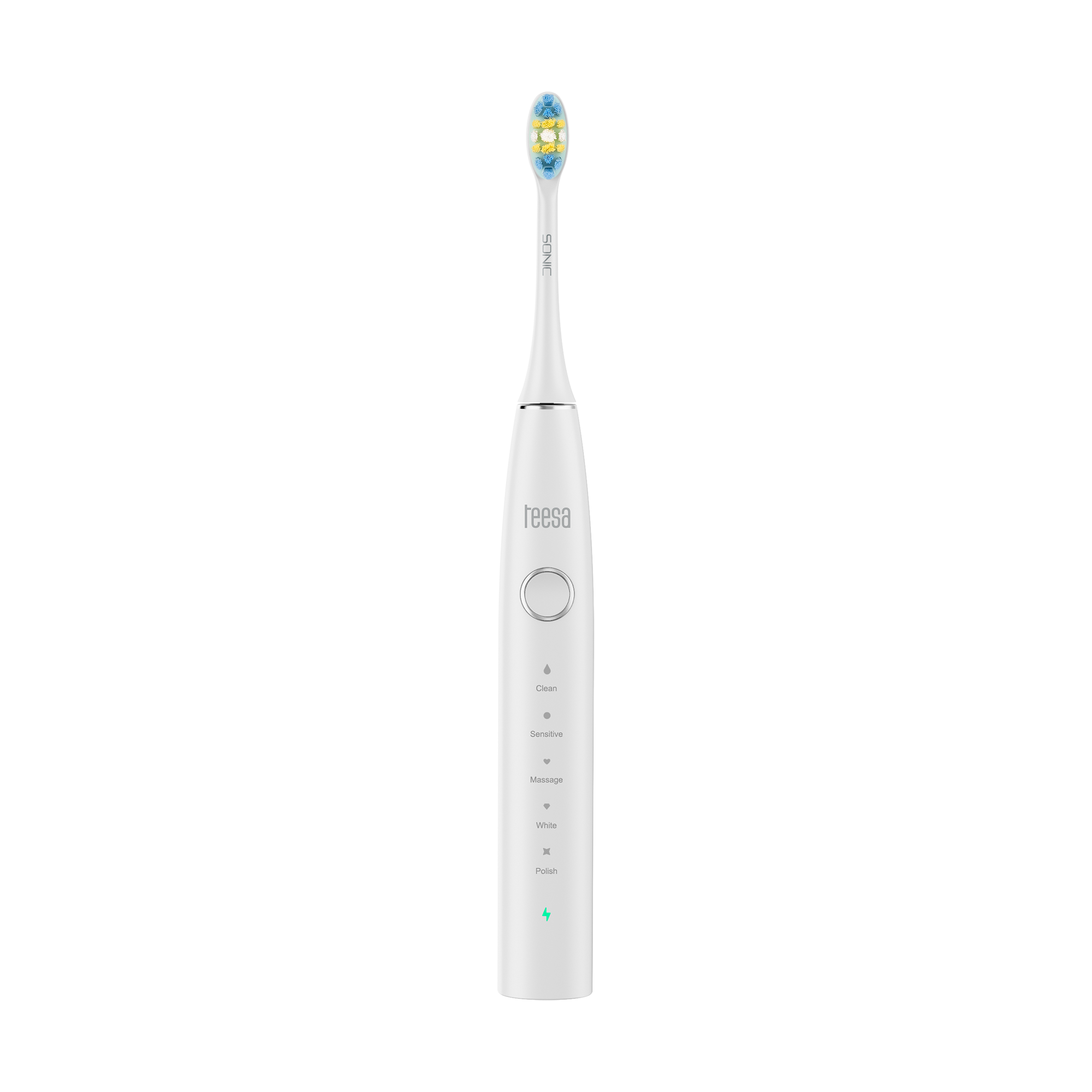 5 trybów pracySzczotka soniczna do zębów Teesa Sonic 2 oferuje 5 trybów: Clean (czyszczenie codzienne), Sensitive (dla wrażliwych dziąseł), Massage (masaż), White (wybielanie), Polish (polerowanie). Dzięki temu możesz dopasować tryb do swoich potrzeb, bez względu na to, czy masz wrażliwe zęby, czy chcesz uzyskać efekt wybielenia.