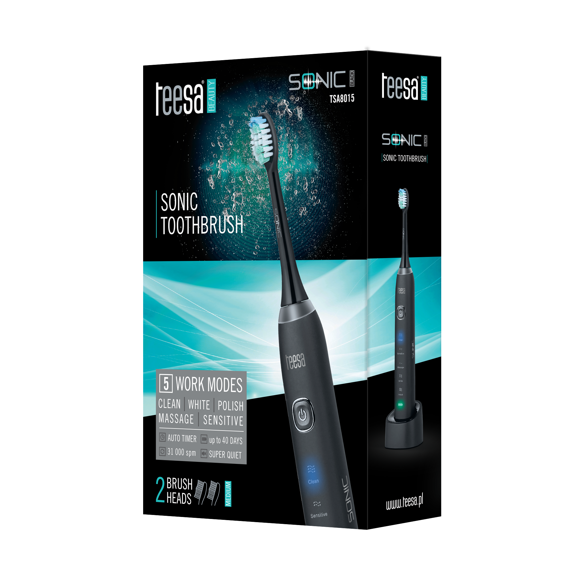31 000 ruchów pulsacyjnychPrzekonaj się o skuteczności technologii sonicznej! Szczoteczka Teesa SONIC Black wykonuje kilkakrotnie więcej ruchów na minutę w porównaniu do obrotowej szczoteczki elektrycznej. Oznacza to, że znacznie dokładniej usuwa płytkę nazębną oraz oczyszcza przestrzenie między zębami.
