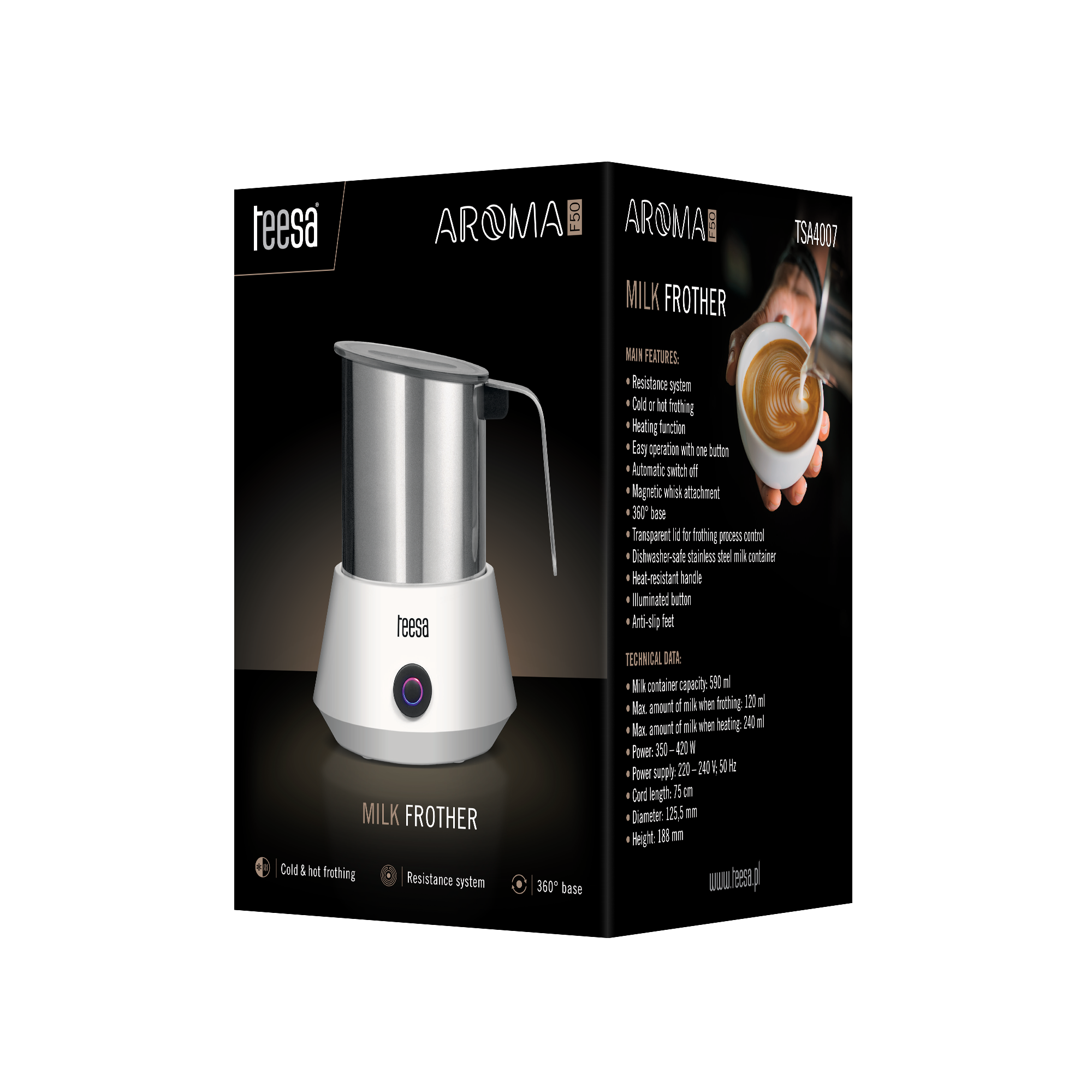 Spieniacz do mleka Teesa AROMA F50Pozwól sobie pomóc dobrze zacząć każdy poranek. A nic tak nie poprawia humoru z rana, jak pyszna kawa z delikatną pianką. Zwłaszcza jeśli jej przygotowanie zajmuje tylko kilka chwil. Spieniacz do mleka Teesa AROMA F50, wykorzystując system indukcyjny w mgnieniu oka pozwoli Ci wyczarować doskonałą piankę mleczną, która nada Twojej kawie magii. Co więcej, dzięki opcji ustawienia zimnej lub ciepłej temperatury, w zależności od nastroju możesz oddać się przyjemności tworzenia cappuccino lub zimnego frappe, a także pysznego kakao lub czekolady dla najbliższych.