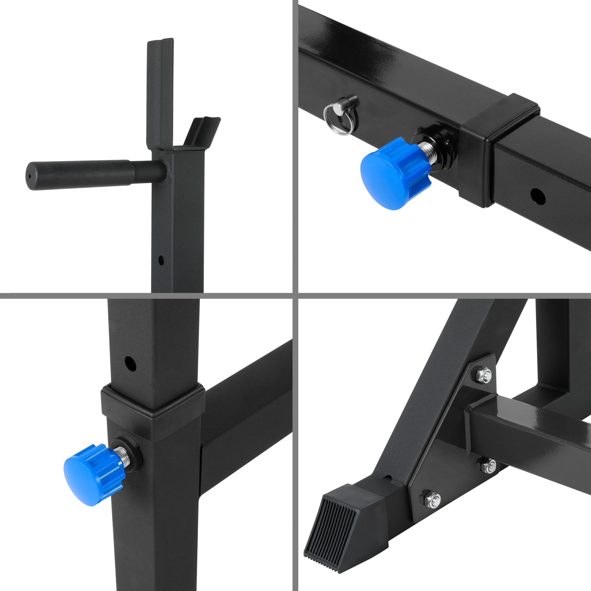 Wszechstronna regulacjaStojaki oferują regulację wysokości w zakresie od 118 do 163 cm z 10 poziomami, co pozwala na dostosowanie do indywidualnych potrzeb i różnych rodzajów ćwiczeń, takich jak przysiady, wyciskanie na ławce czy podciąganie sztangi. Dodatkowo, środkowa półka posiada 5 poziomów regulacji wysokości (od 64 do 94 cm), co zwiększa ich funkcjonalność i bezpieczeństwo, oferując asekurację podczas ćwiczeń.