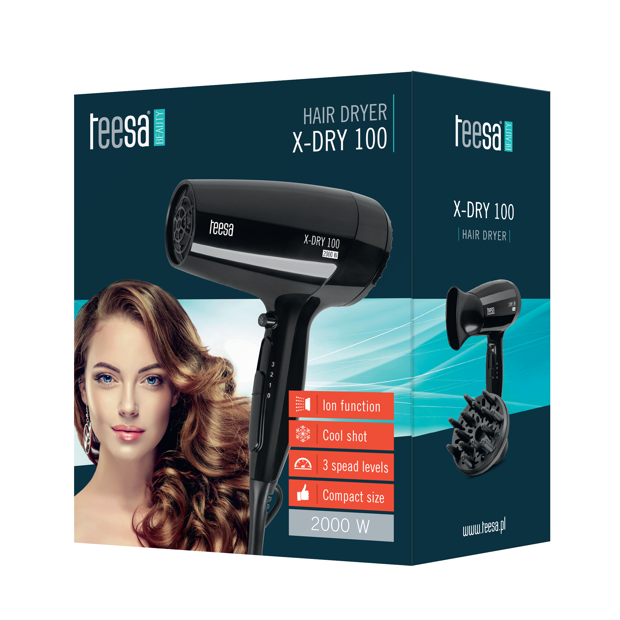 Suszarka Teesa X-DRY 100To lekkie i poręczne urządzenie o mocy 2000 W, które umożliwia wysuszenie włosów szybko i efektywnie. X-DRY 100 daje możliwość wyboru 3 prędkości nawiewu, co pozwala w pełni kontrolować suszenie i modelowanie włosów. Do utrwalenia fryzury sprawdzi się nawiew chłodnego powietrza, a funkcja jonizacji sprawia, że włosy nie elektryzują się, są bardziej wygładzone i wyglądają zdrowo.