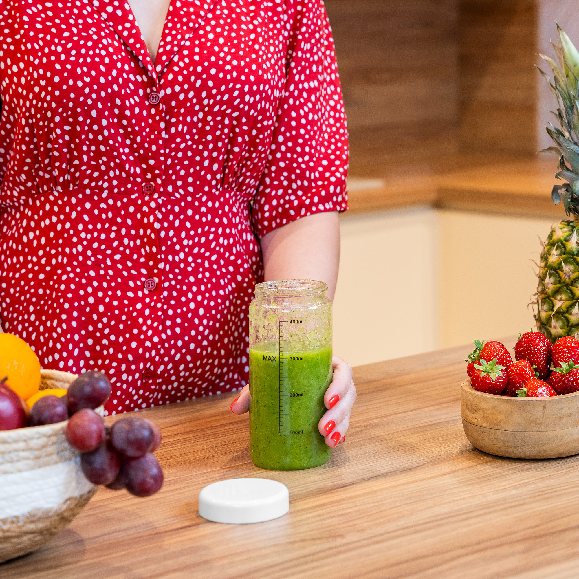 Zabierz go, gdzie chcesz Przygotuj swój koktajl bezpośrednio w 450 ml kubku ze szkła borokrzemowego, który następnie możesz zakręcić dołączoną nakładką ułatwiającą transport i zabrać gdzie tylko chcesz: do pracy, szkoły, na spacer lub na trening.