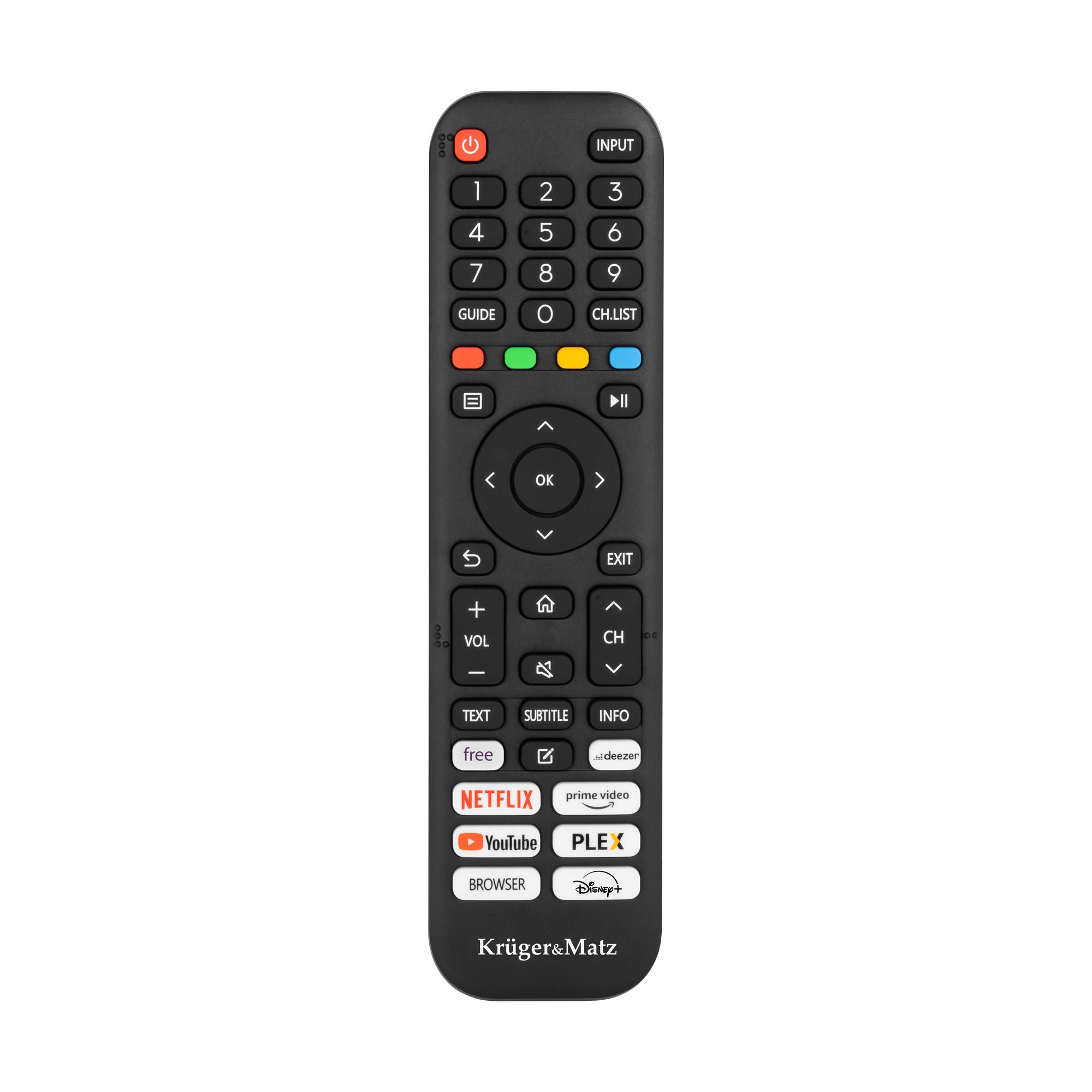 Wygodna i szybka obsługaDołączony do telewizora Kruger&Matz pilot został zaprojektowany z myślą o wygodnym i intuicyjnym użytkowaniu. Na pilocie znajdują się skróty do najpopularniejszych aplikacji, takich jak Netflix, YouTube czy Amazon Prime Video. Dzięki nim możesz szybko uruchomić ulubione treści bez konieczności przeglądania menu czy wyszukiwania aplikacji.