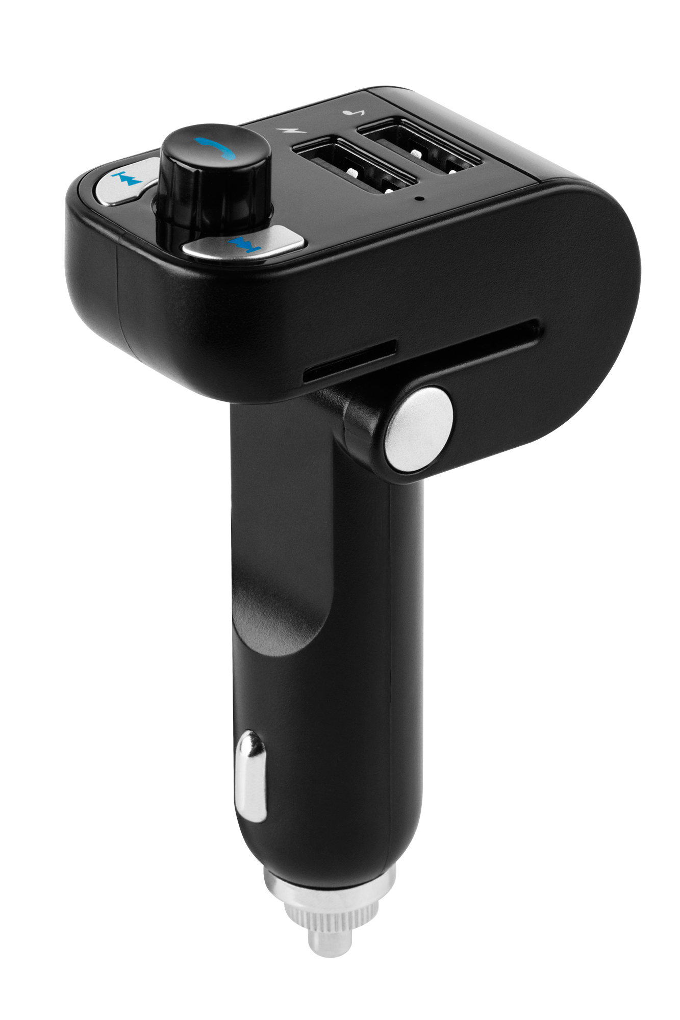 Wysoka funkcjonalnośćCentrum zarządzania funkcjami transmitera stanowią umieszczone na urządzeniu przyciski i pokrętło. Możesz za ich pomocą zmienić częstotliwość, odebrać/kończyć połączenie, regulować głośność oraz zmieniać utwory. Z kolei aktualną częstotliwość z łatwością sprawdzisz na wyświetlaczu LED.