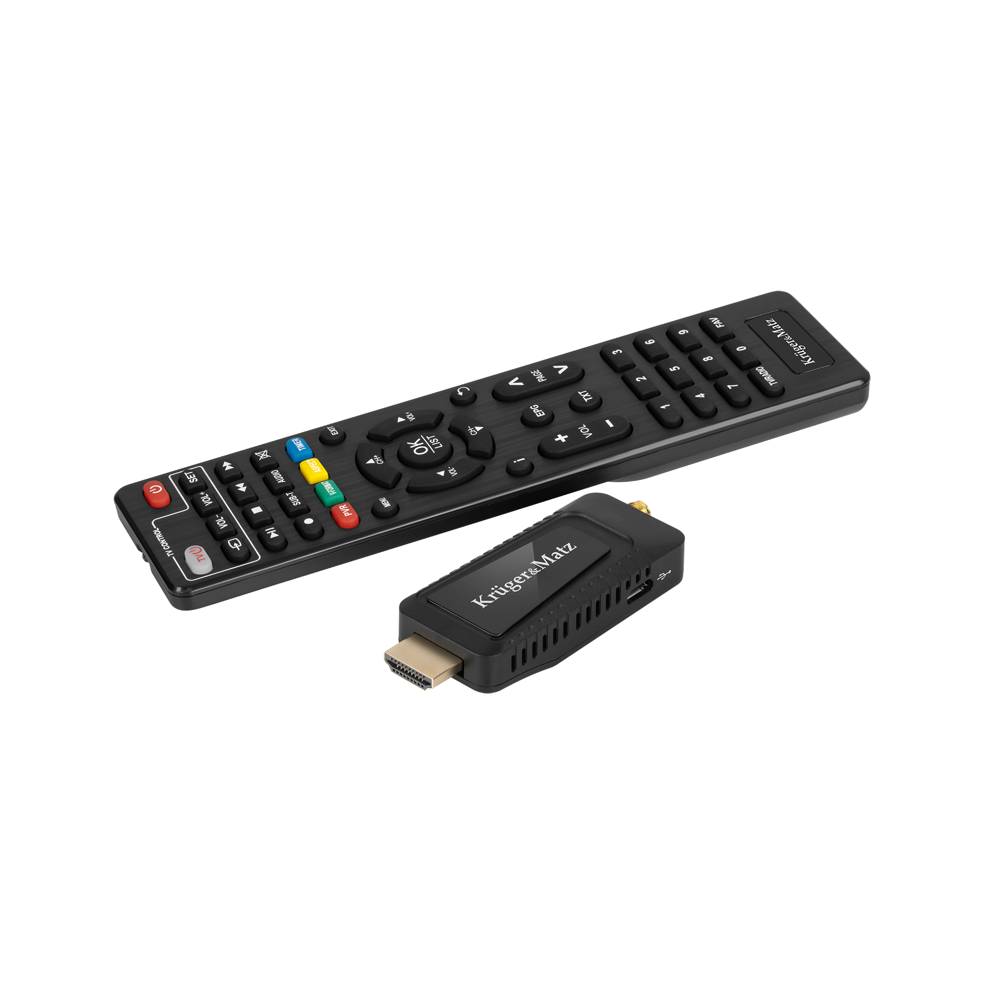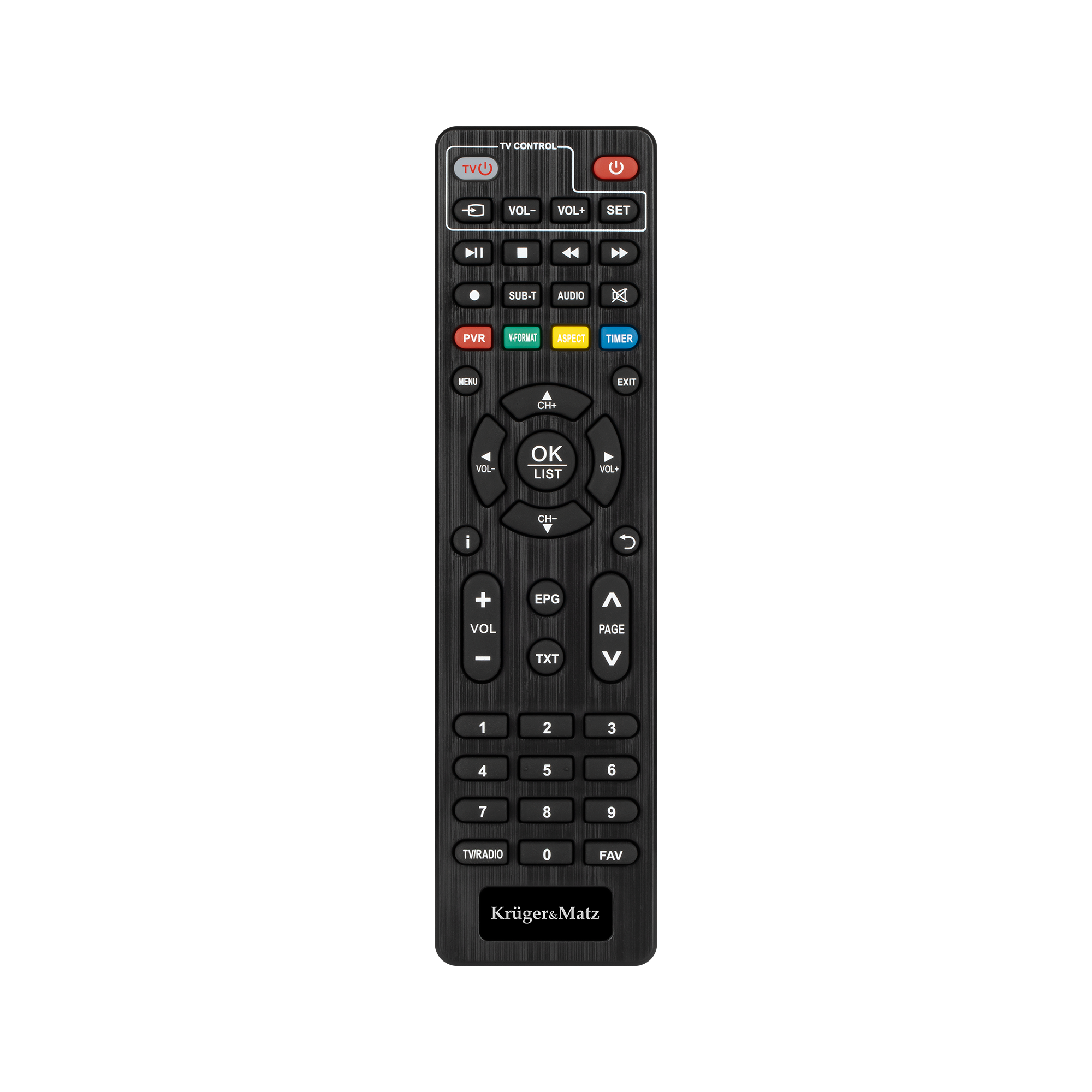 TV CONTROL - obsługa jednym pilotemUmieszczony z tyłu telewizora tuner DVBT Kruger&Matz jest niewidoczny, ale to nie zmniejsza komfortu obsługi urządzenia. Dołączony do zestawu odbiornik IR oraz poręczny pilot z programowalnymi przyciskami sprawia, że bez problemu możesz korzystać ze wszystkich funkcji urządzenia. Co więcej odpowiednie zaprogramowanie przycisków sprawi, że jednym pilotem szybko i bez problemu będziesz mógł zarządzać funkcjami zarówno telewizora, jak i tunera.