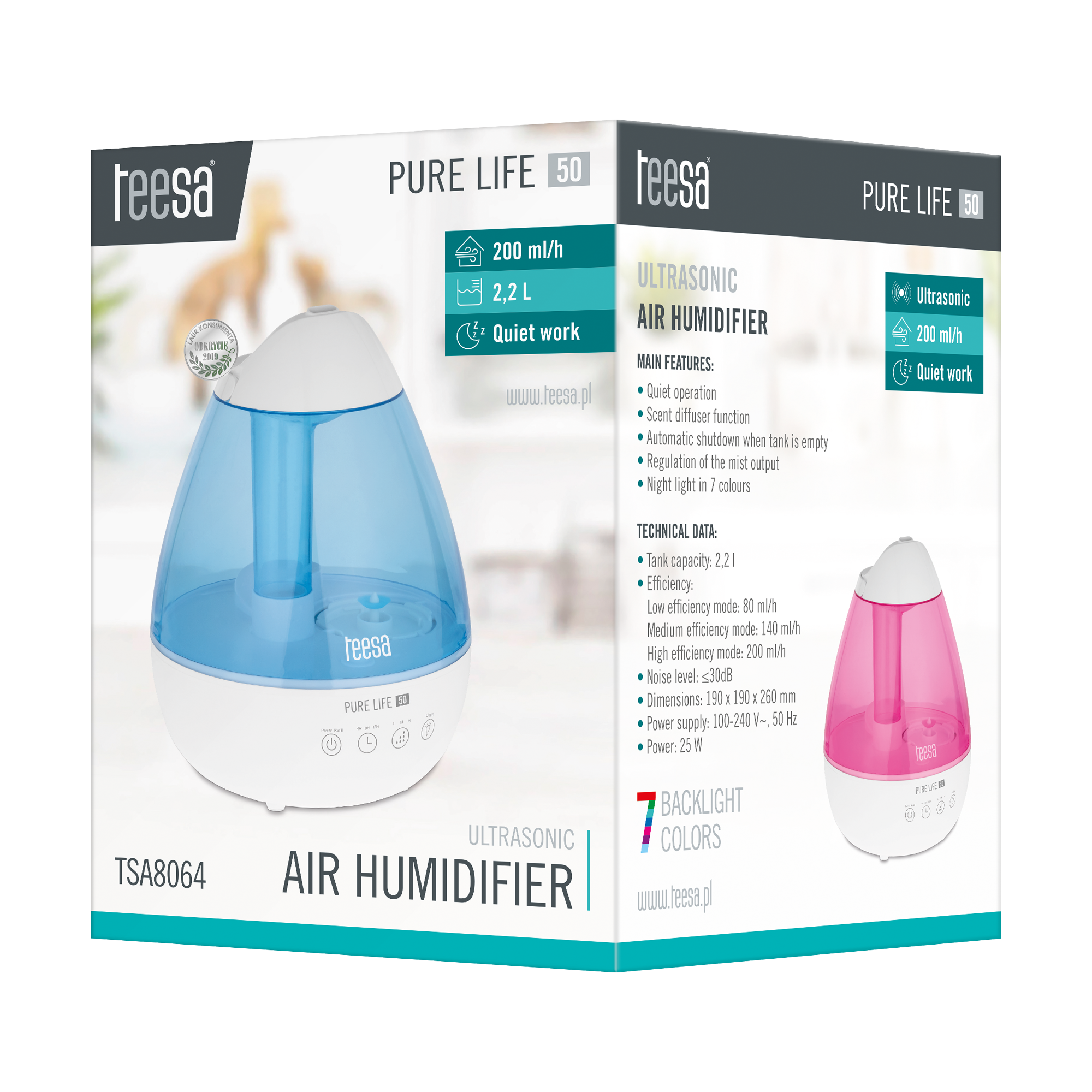 Ultradźwiękowy nawilżacz powietrza Teesa PURE LIFE 50Zadbaj o swoje zdrowie i wybierz Teesa PURE LIFE 50. Ten mały nawilżacz powietrza znacznie poprawi jakość powietrza w Twoim domu i pozwoli Ci odetchnąć pełną piersią. Działanie tego urządzenia opiera się na wykorzystaniu fal ultradźwiękowych, co jest gwarancją bardzo cichej pracy i niskiego poboru energii.