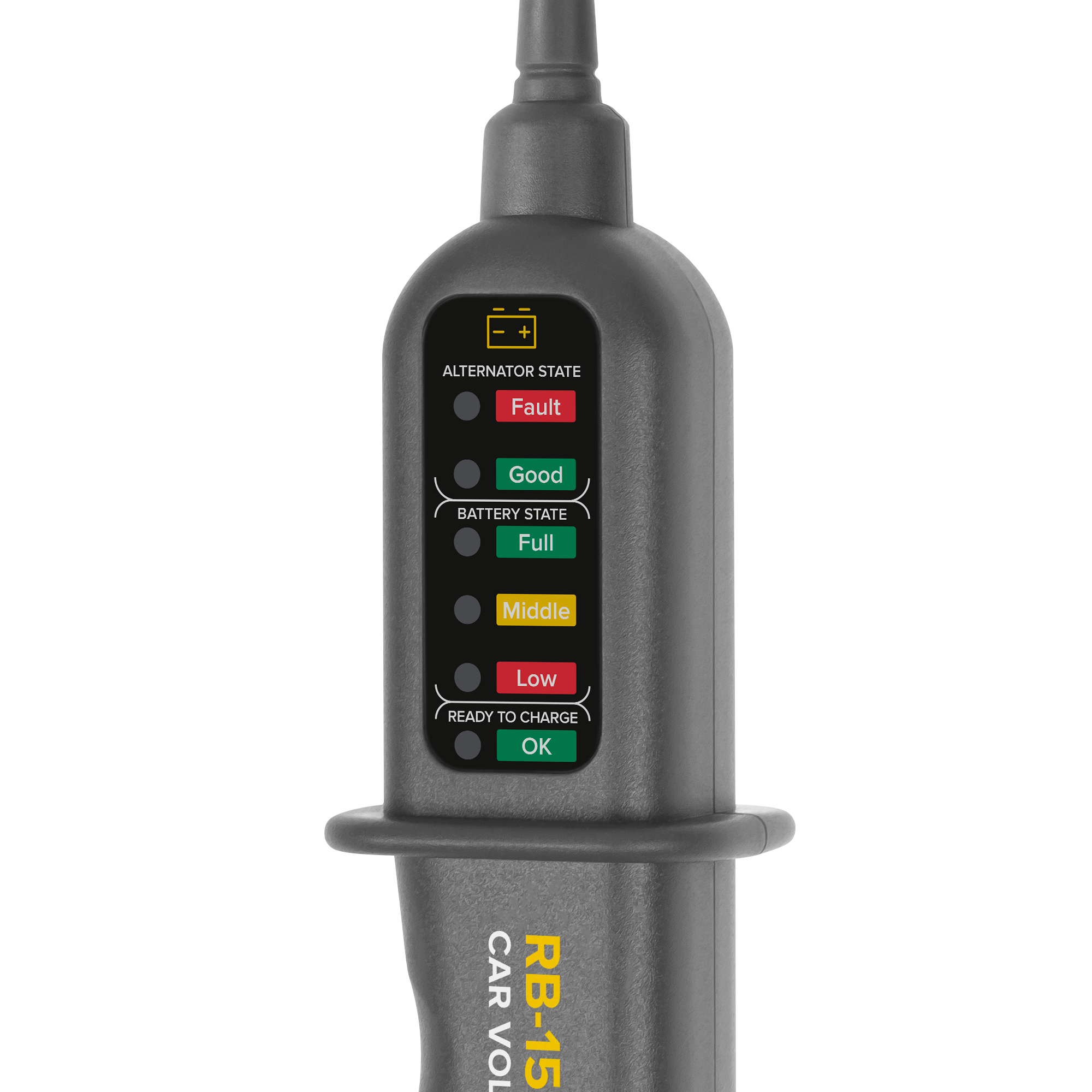 Test alternatora i akumulatora 12 VWskaźnik REBEL RB-15C umożliwia szybkie i skuteczne sprawdzenie stanu alternatora oraz poziomu naładowania akumulatora 12 V. Funkcja ta jest kluczowa dla diagnozowania problemów związanych z układem ładowania w pojazdach, pomagając zapobiegać awariom i utrzymując samochód w pełnej sprawności. Dzięki temu narzędziu można łatwo wykryć ewentualne problemy z ładowaniem, zanim doprowadzą one do poważniejszych usterek.