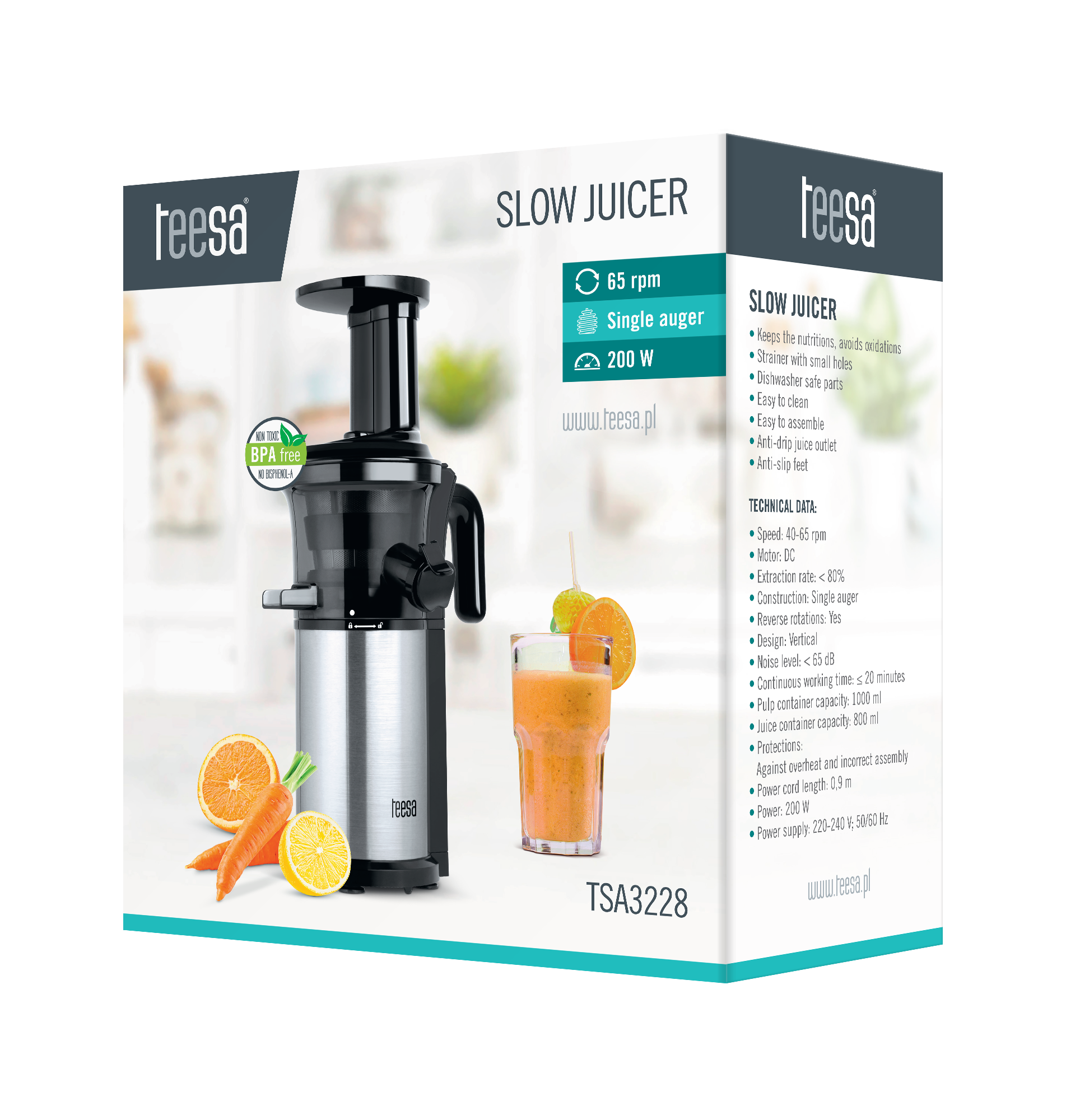 Wyciskarka wolnoobrotowaLubisz zaczynać dzień od dawki witamin? Z pewnością pokochasz nową wyciskarkę wolnoobrotową Teesa do warzyw i owoców. Urządzenie jest wolne od BPA – to znaczy, że zostało wyprodukowane bez użycia materiałów zawierających bisfenol, co jest szczególnie ważne dla walorów zdrowotnych wyciskanego soku. Pionowa konstrukcja oraz obudowa ze stali nierdzewnej sprawiają, że wyciskarka nie zajmuje wiele miejsca na blacie i doskonale współgra z wyposażeniem nowoczesnej kuchni.