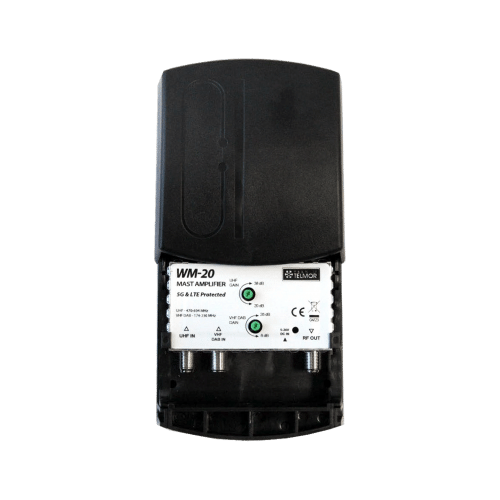 WM – 20 – dwa wejścia, pierwsze dla pasma UHF w zakresie od 470-694MHz, wzmocnienie 20..38dB, drugie dla pasma VHF/DAB 174-240MHz, wzmocnienie 8..28dB