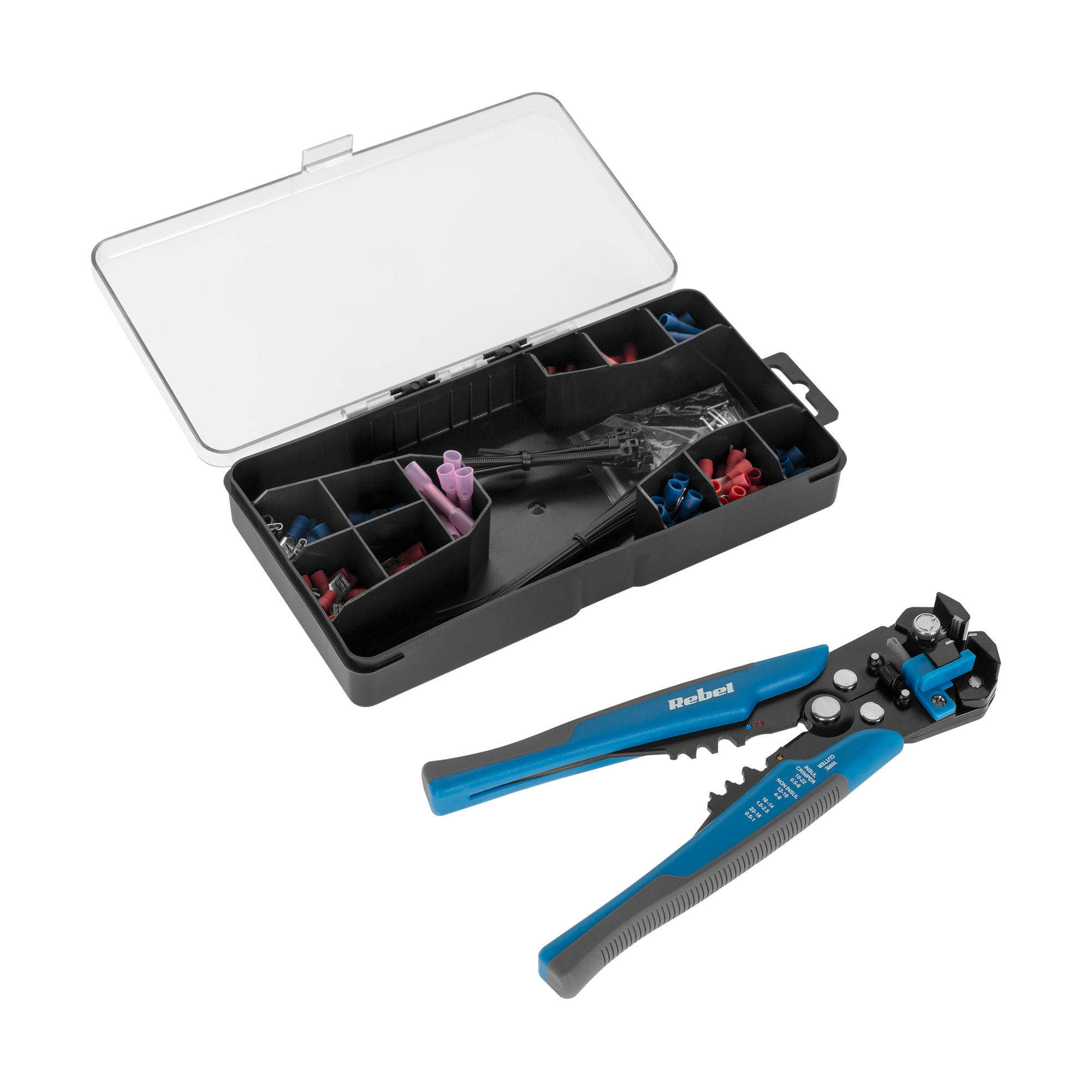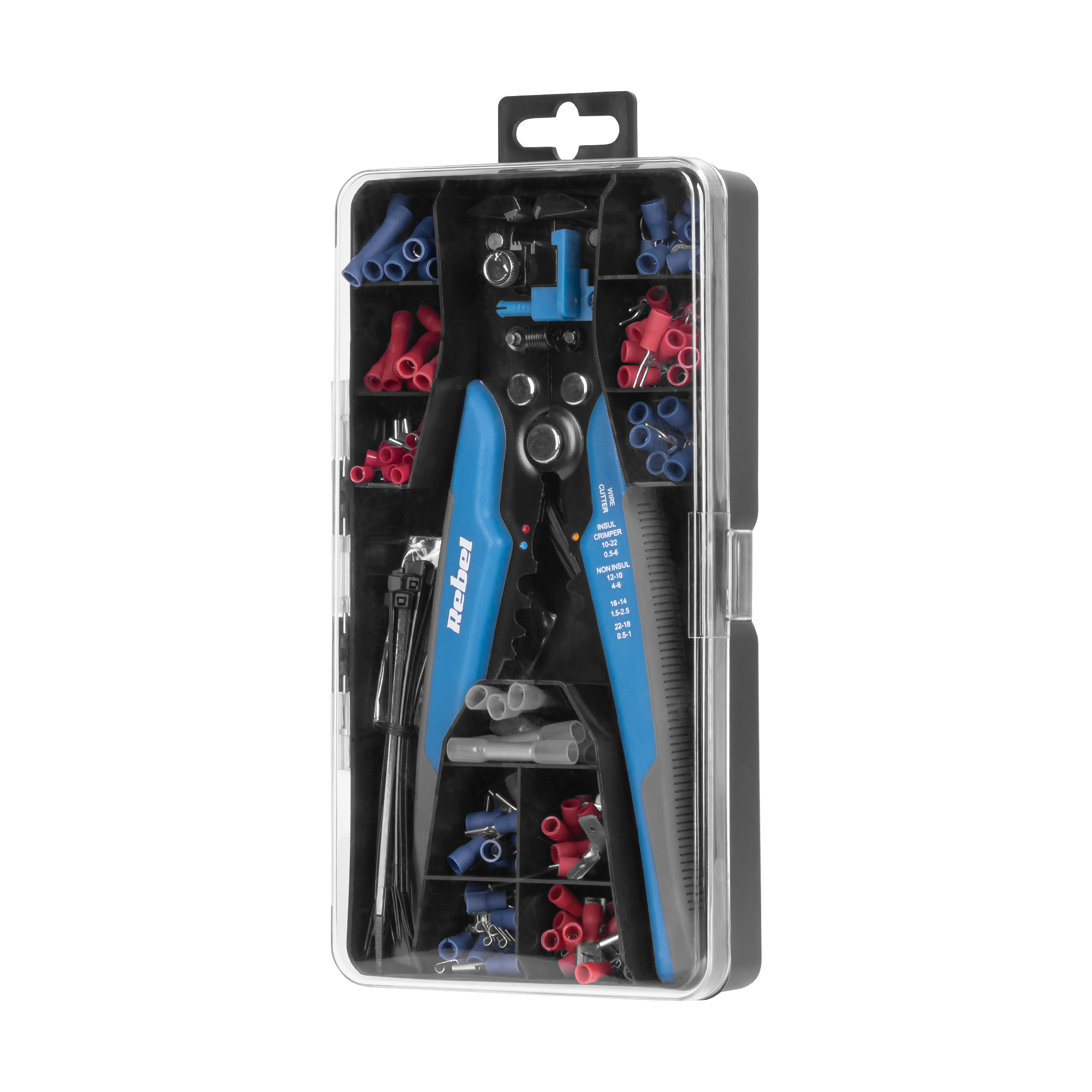 Zaciskarka - zestaw konektorówSzukasz wszechstronnego zestawu, który ułatwi Ci prace elektryczne? Zaciskarka - zestaw konektorów zawiera wszystko, czego potrzebujesz, aby przeprowadzać profesjonalne i precyzyjne naprawy oraz montaż. W skład zestawu wchodzi zaciskarka z funkcją ściągacza izolacji, która sprawia, że proces łączenia przewodów jest szybki i bezbłędny. 30 konektorów widełkowych, 30 oczkowych, 30 płaskich męskich oraz 15 płaskich żeńskich, pozwolą na elastyczne dopasoawnie do różnych zadań.