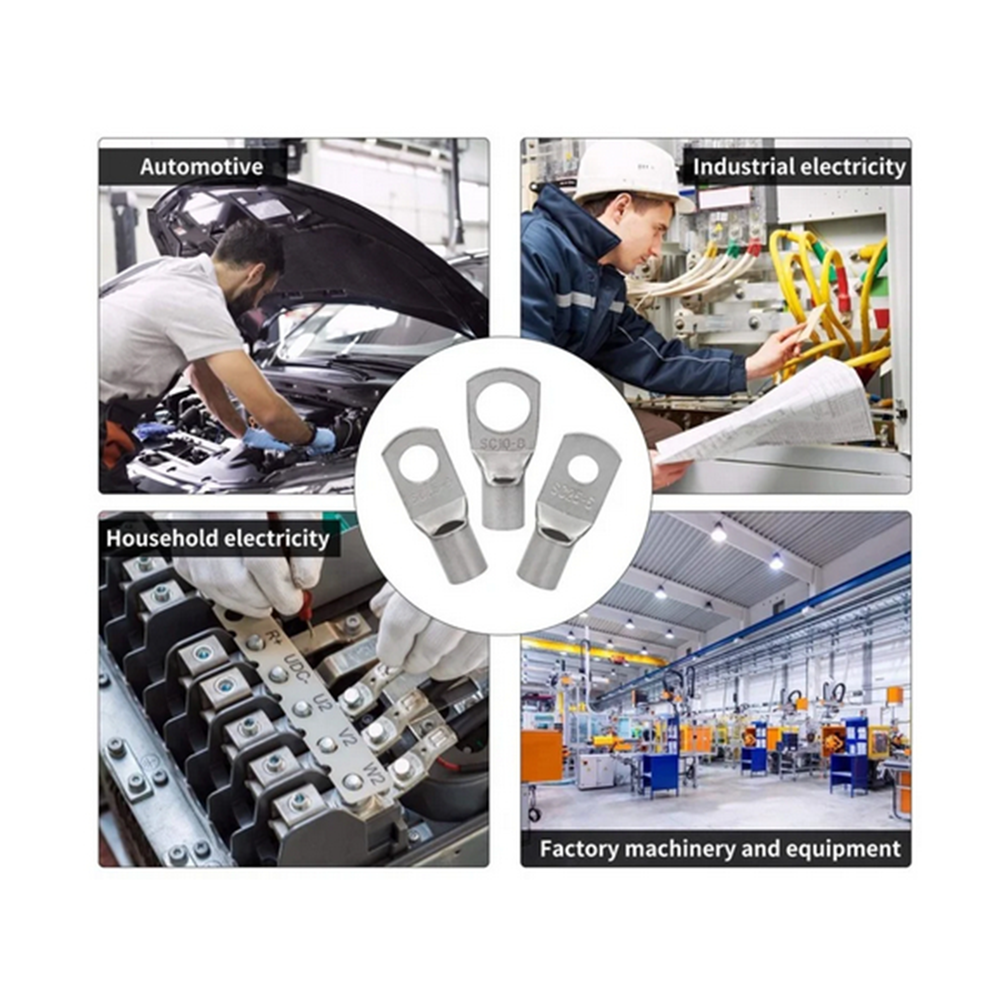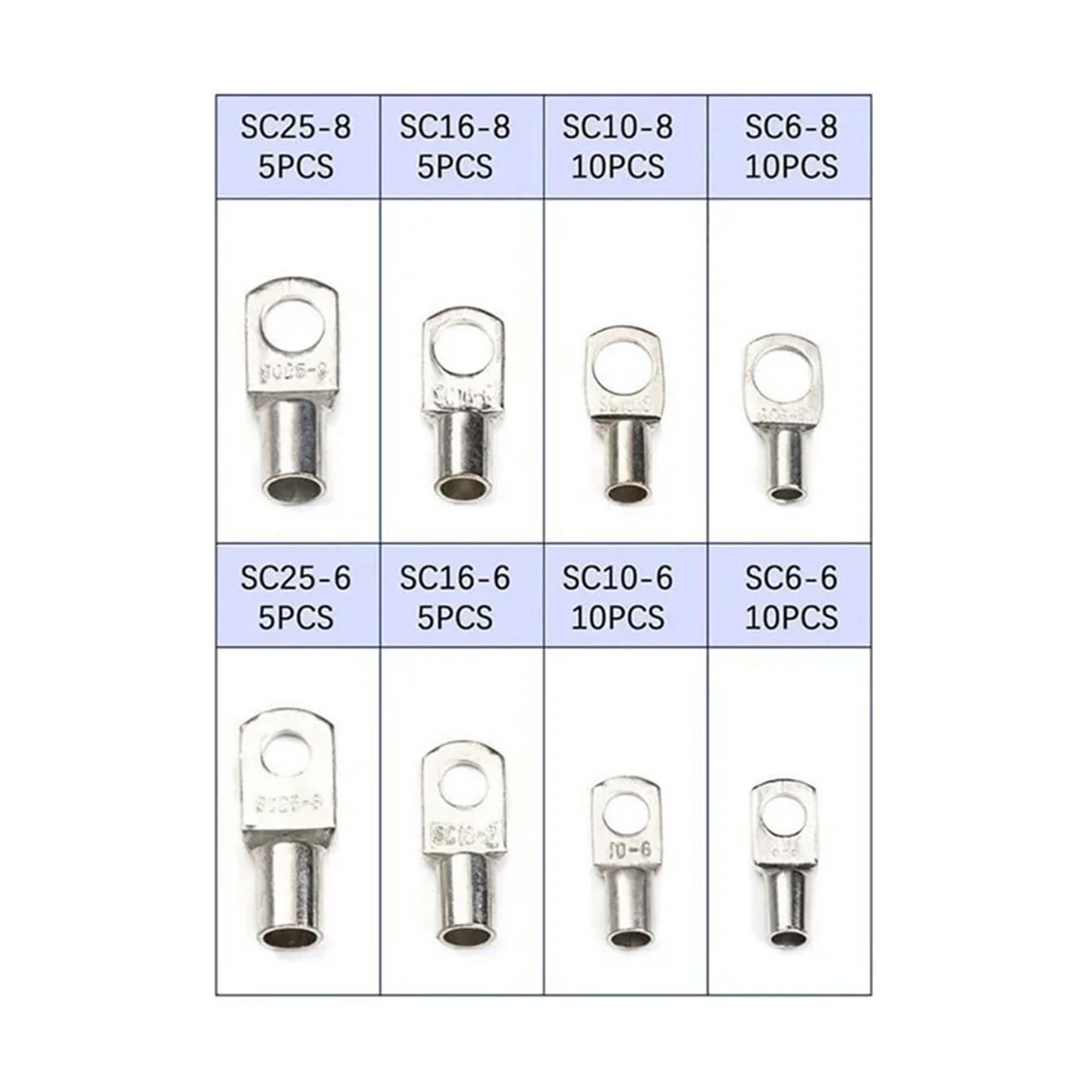 ContentZestaw 60 zakończeń oczkowych na kabel Najwyższej jakości produkt miedziany cynowany, przyjazny dla środowiska, bezpieczny w użyciu Różne końcówki zaciskane zapakowane w podręczne etui z przegródkami Specyfikacja: materiał: miedź cynowana kolor: srebrny ilość: 60 sztuk / 1 zestaw Paczka zawiera: 5 sztuk x zaciski SC25-8 (szerokość otworu na przewód 7mm, otwór na śrubę 8,5mm) 5 sztuk x zaciski SC25-6 (szerokość otworu na przewód 7mm, otwór na śrubę 6,5mm) 5 sztuk x zaciski SC16-8 (szerokość otworu na przewód 6mm, otwór na śrubę 8,5mm) 5 sztuk x zaciski SC16-6 (szerokość otworu na przewód 6mm, otwór na śrubę 6,5mm) 10 sztuk x zaciski SC10-8 (szerokość otworu na przewód 5,4mm, otwór na śrubę 8,5mm) 10 sztuk x zaciski SC10-6 (szerokość otworu na przewód 5,4mm, otwór na śrubę 6,5mm) 10 sztuk x zaciski SC6-8 (szerokość otworu na przewód 4,1mm, otwór na śrubę 8,5mm) 10 sztuk x zaciski SC6-6 (szerokość otworu na przewód 4,1mm, otwór na śrubę 6,5mm) Zestaw 60 zakończeń oczkowych na kabel