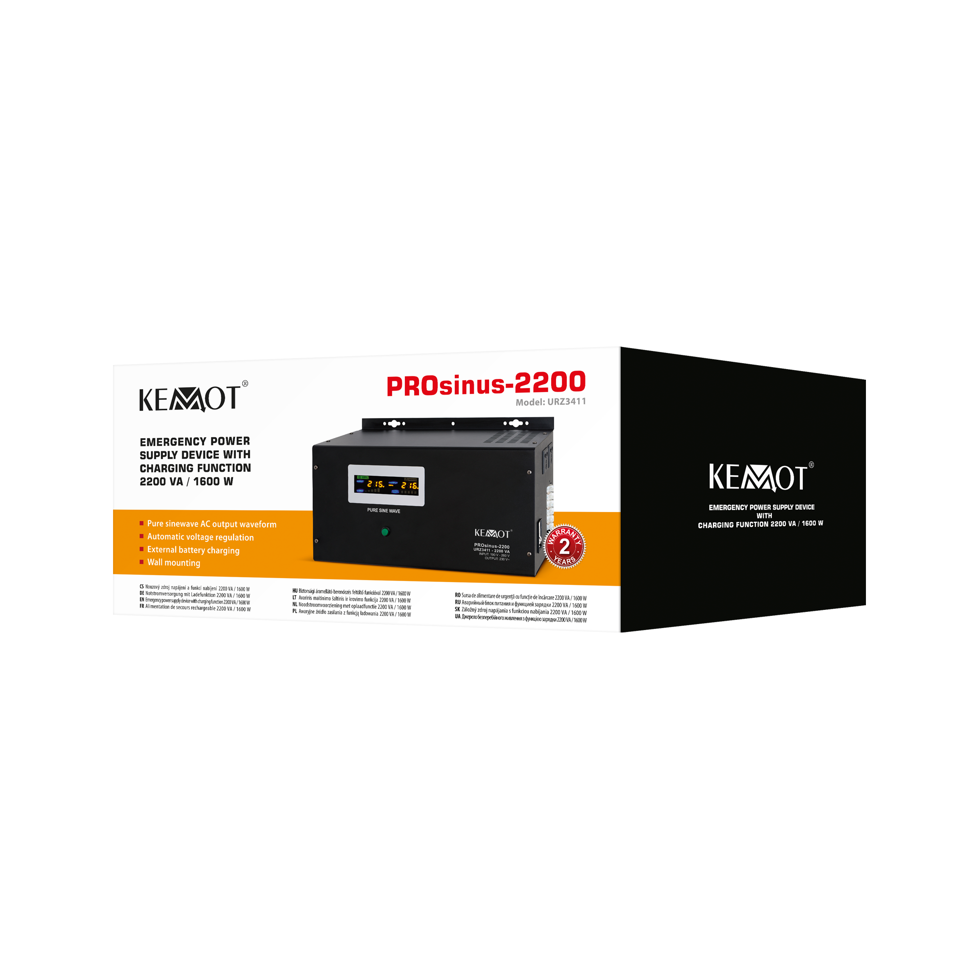 Zasilacz awaryjny KEMOT PROsinus-2200 -SUPER MOCNY2200 VA / 1600 W• Moc znamionowa: 1600 W • Rodzaj baterii: 12 V DC • Napięcie wejściowe: 190 - 260 V AC • Napięcie wyjściowe: 230 V AC +/-8% • Kształt napięcia wyjściowego: czysta sinusoida • Prąd ładowania akumulatora: 20 A • Czas przełączania: =< 4 ms