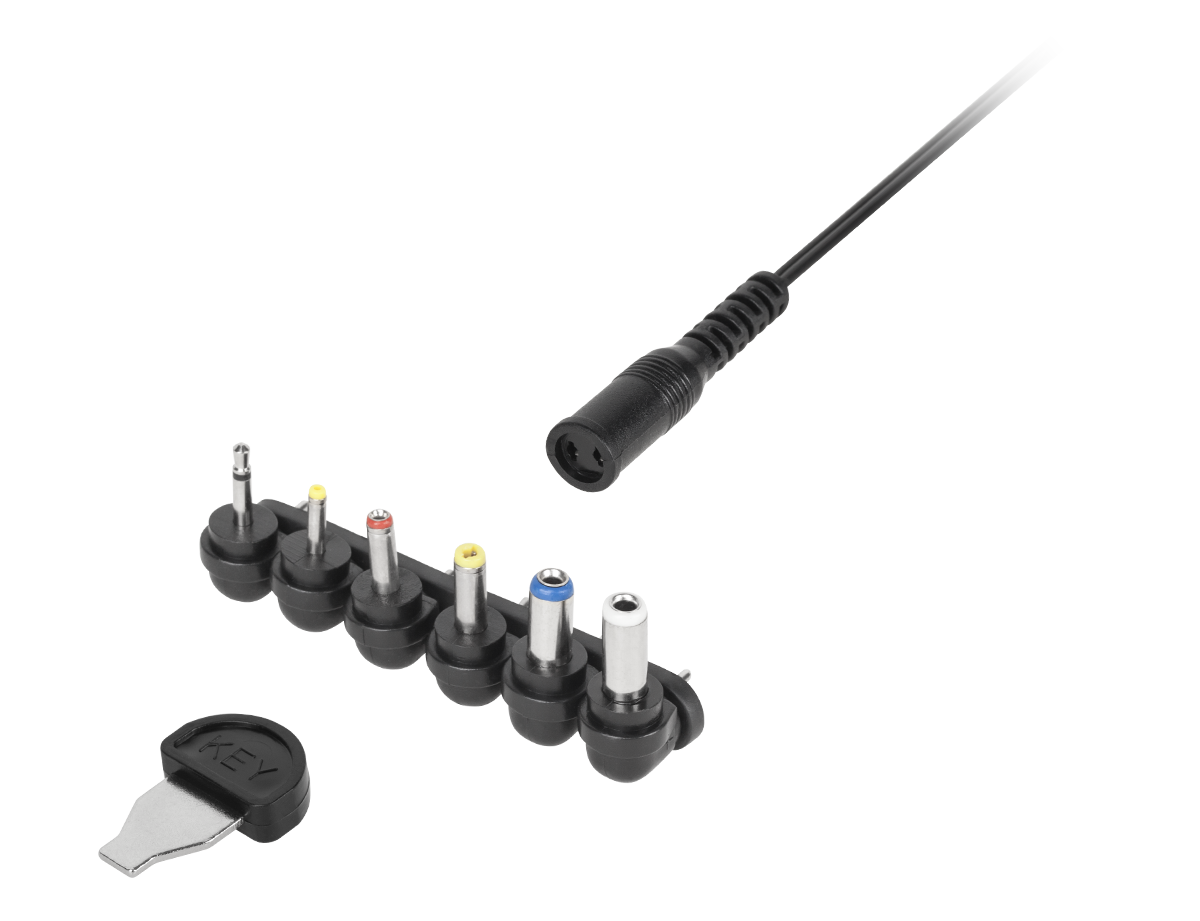 6 uniwersalnych wtyków: 3,5x1,35 mm, 5,5x2,1 mm, 5,5x2,5 mm, 2,35x0,7 mm, 4,0x1,7 mm, 2,5 mm mono