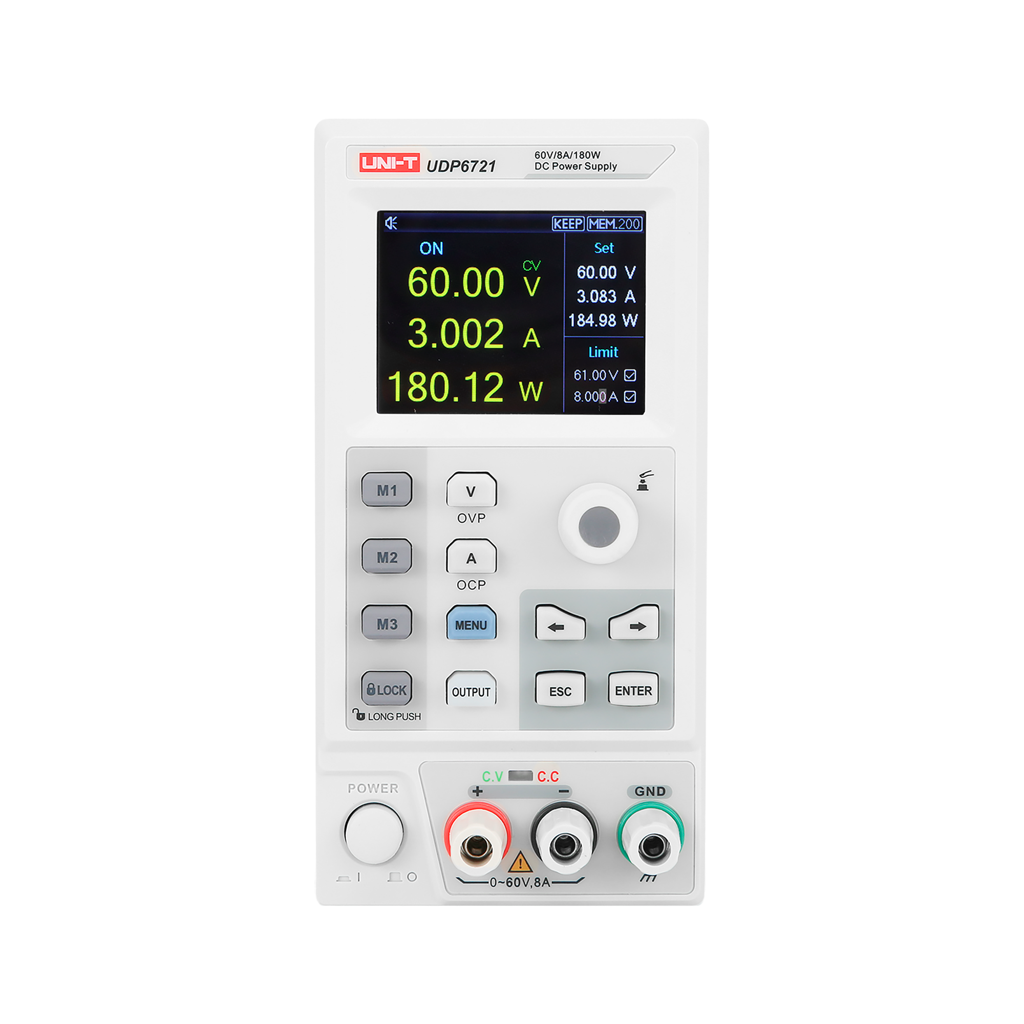 Wysoka Precyzja i StabilnośćUDP6721 oferuje szeroki zakres napięcia wyjściowego od 0 do 60 V oraz prądu od 0 do 8 A, z maksymalną mocą wyjściową do 180 W. Dzięki wysokiej rozdzielczości regulacji (10 mV/1 mA na całym zakresie), zasilacz umożliwia precyzyjne ustawienie i kontrolę parametrów, co jest kluczowe w zaawansowanych aplikacjach testowych. Niski poziom pulsacji i szumów (<5.0 mV rms dla napięcia i <8 mA rms dla prądu) zapewnia stabilne zasilanie, minimalizując wpływ zakłóceń na badane obwody.
