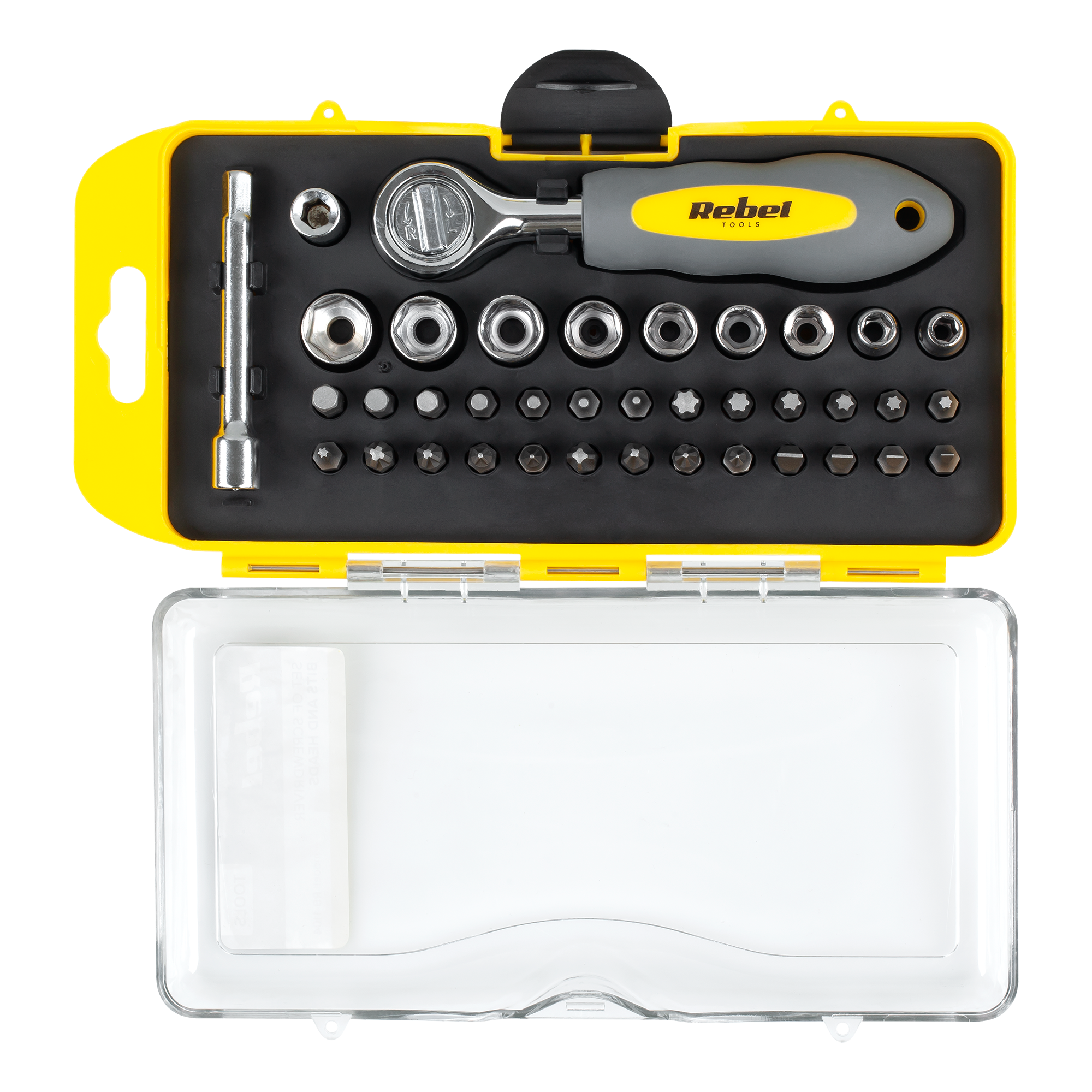 Zestaw 38 bitów i nasadek z kluczem grzechotkowym Rebel ToolsChcesz mieć odpowiednią ilość niezbędnych narzędzi ułatwiających montowanie i naprawę? Bądź zawsze przygotowany do pracy! RB-1104, tj. zestaw 38 bitów Rebel Tools, to coś, co każdy majsterkowicz powinien mieć w swoim warsztacie. Każde z dołączonych do niego akcesoriów tj. klucz grzechotkowy, adapter magnetyczny, uchwyt przedłużający, 9 nasadek i różne rodzaje bitów zdecydowanie ułatwią Ci majsterkowanie.