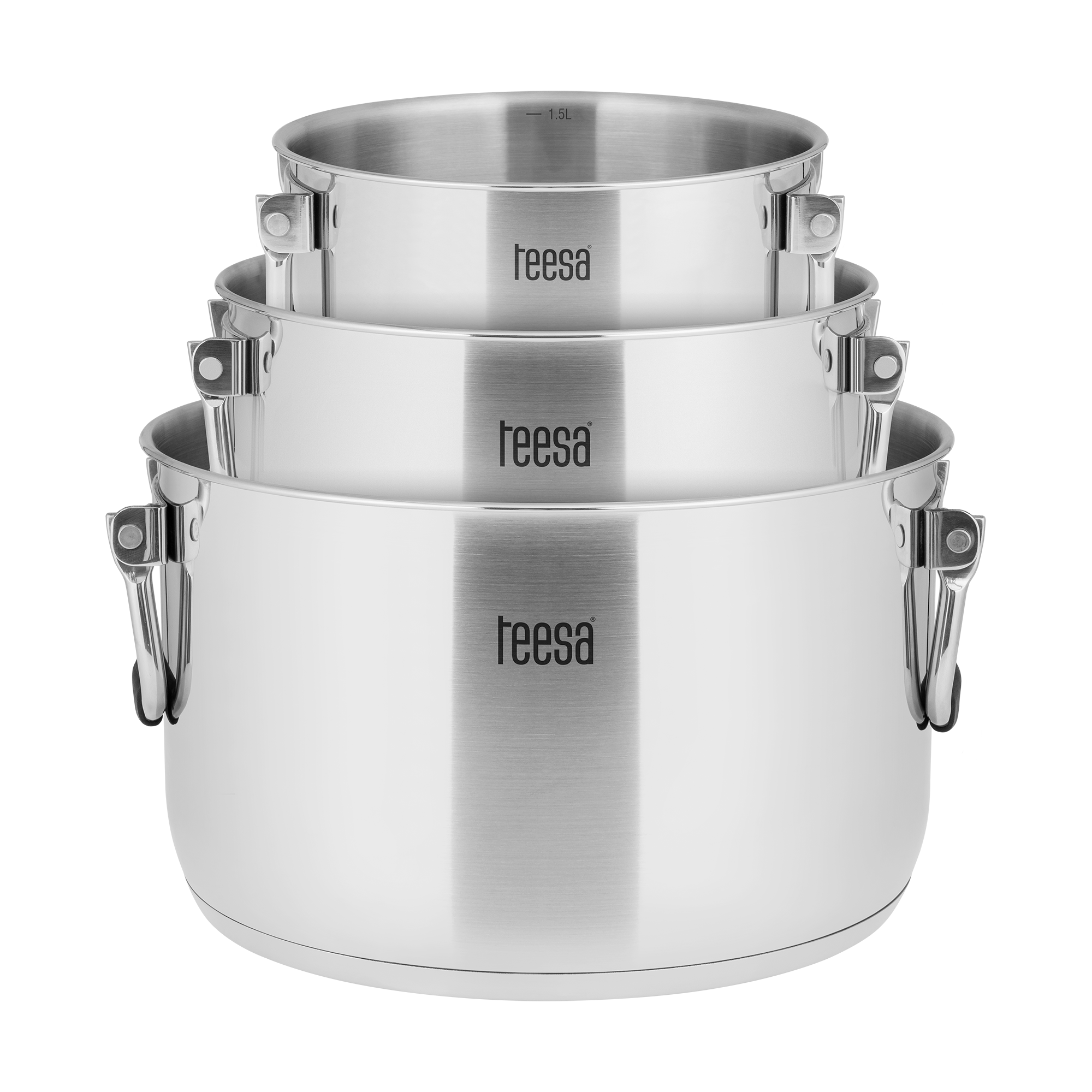Składane uchwyty Zestaw garnków Teesa został zaprojektowany z myślą o wygodzie i oszczędności miejsca. Przemyślana konstrukcja z nitowanymi, składanymi uchwytami to prawdziwe wybawienie i to nie tylko w małych kuchniach. Koniec z bałaganem w szafkach i wiecznym szukaniem pokrywki do odpowiedniego garnka. Dzięki możliwości wkładania jednego garnka w drugi zaoszczędzisz cenne miejsce w swojej kuchni.