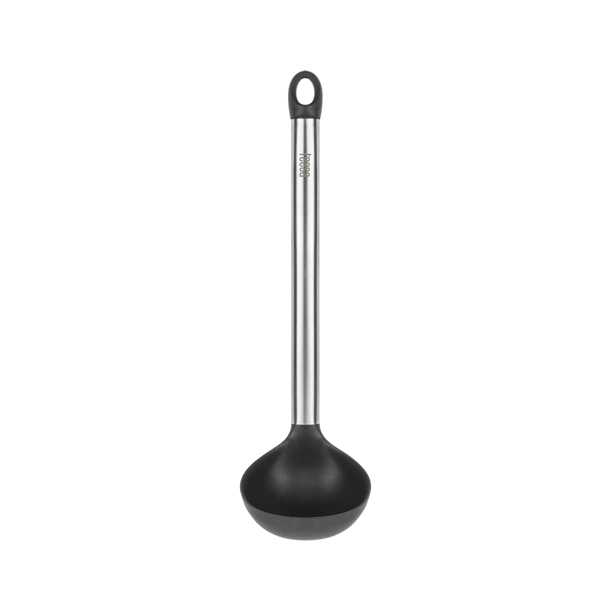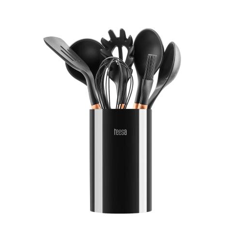 Eleganckie akcesoria w komplecie W skład zestawu wchodzą wszystkie niezbędne akcesoria, które pomogą Ci w przygotowaniu codziennych posiłków, np. chochla, łyżka do serwowania potraw oraz do spaghetti, łopatka i łyżka cedzakowa, trzepaczka i szczypce. Dołączony do zestawu pojemnik, w połączeniu z elegancją akcesoriów sprawi, że zamiast trzymać przybory w szufladzie, będziesz chciała je wyeksponować, by były zawsze pod ręką.